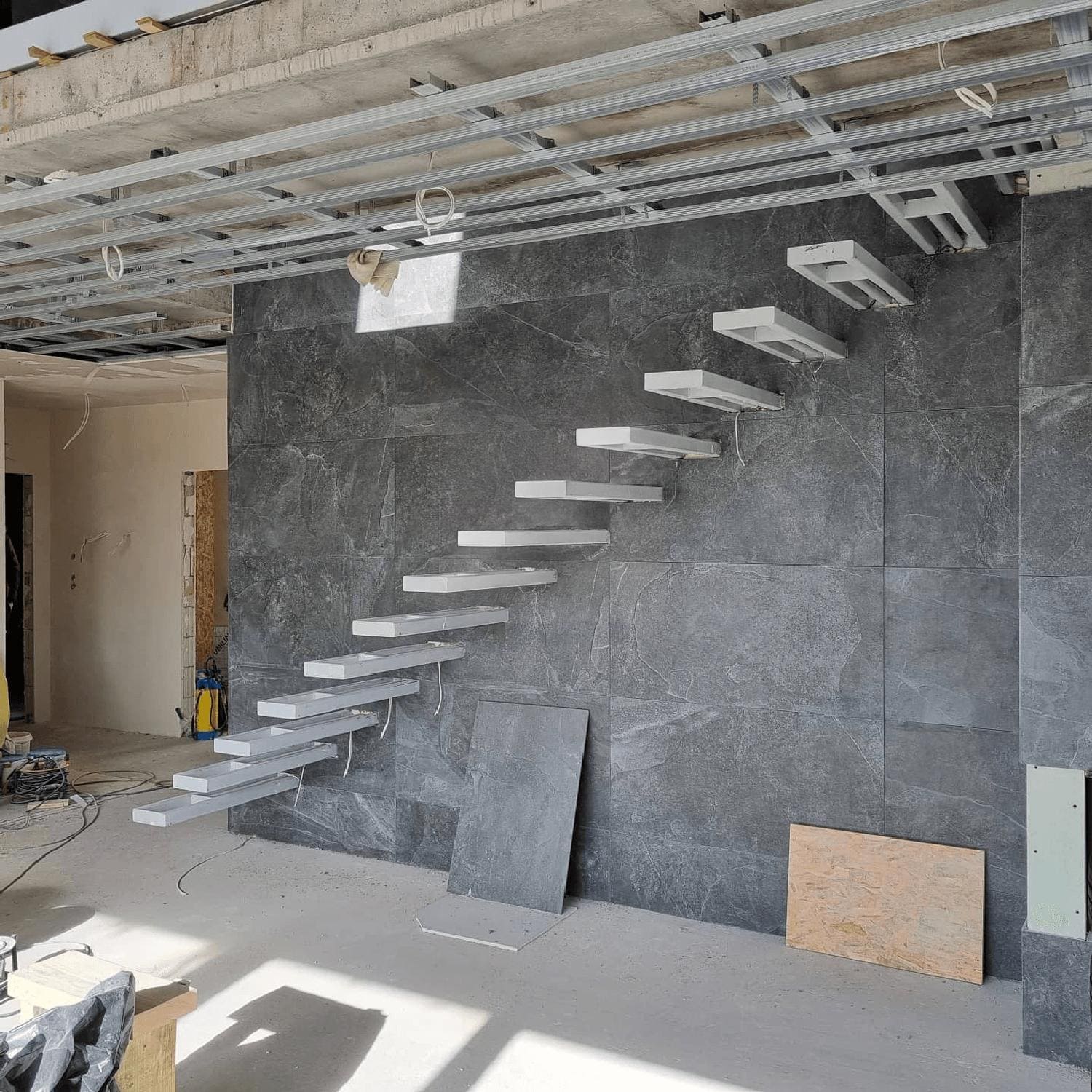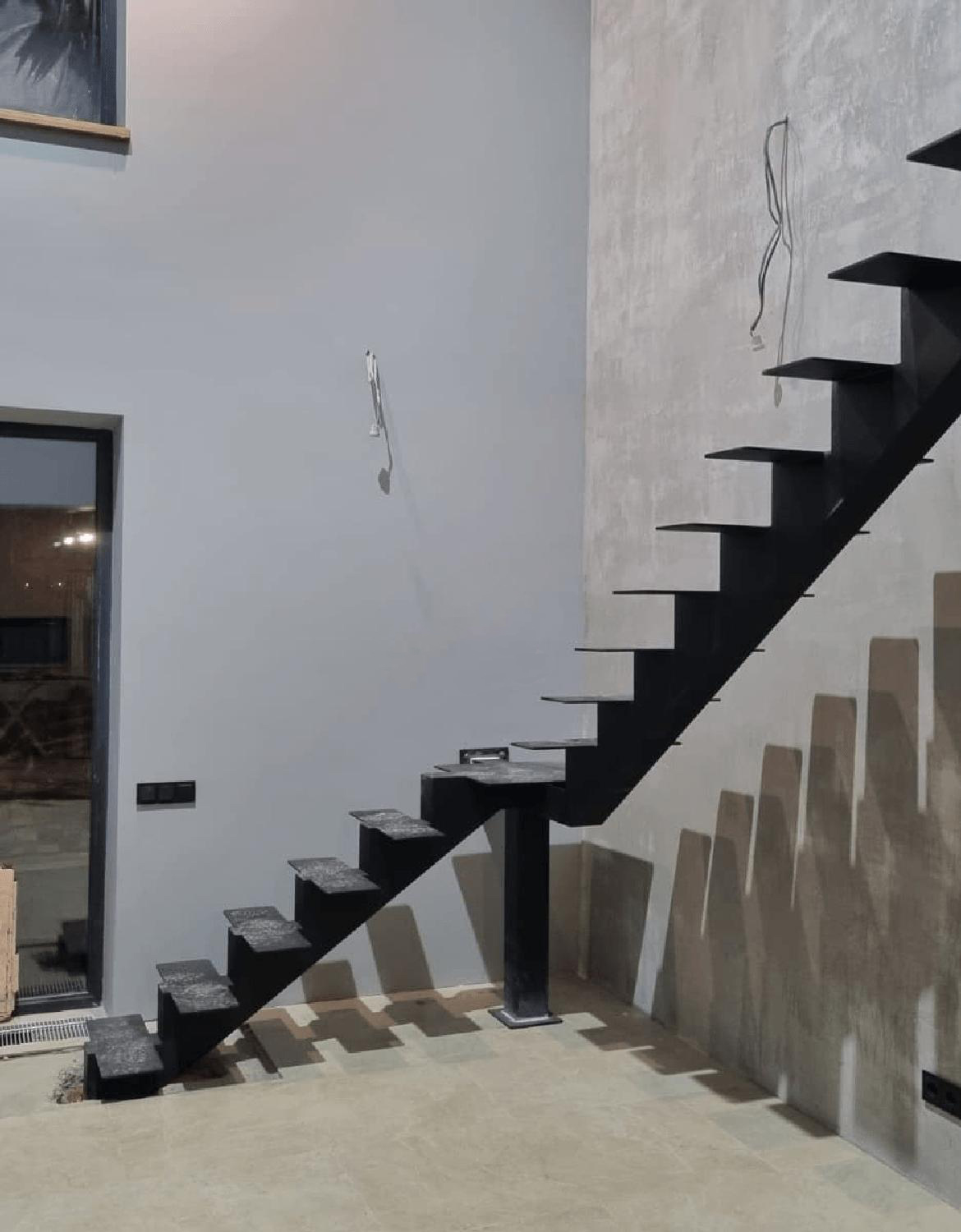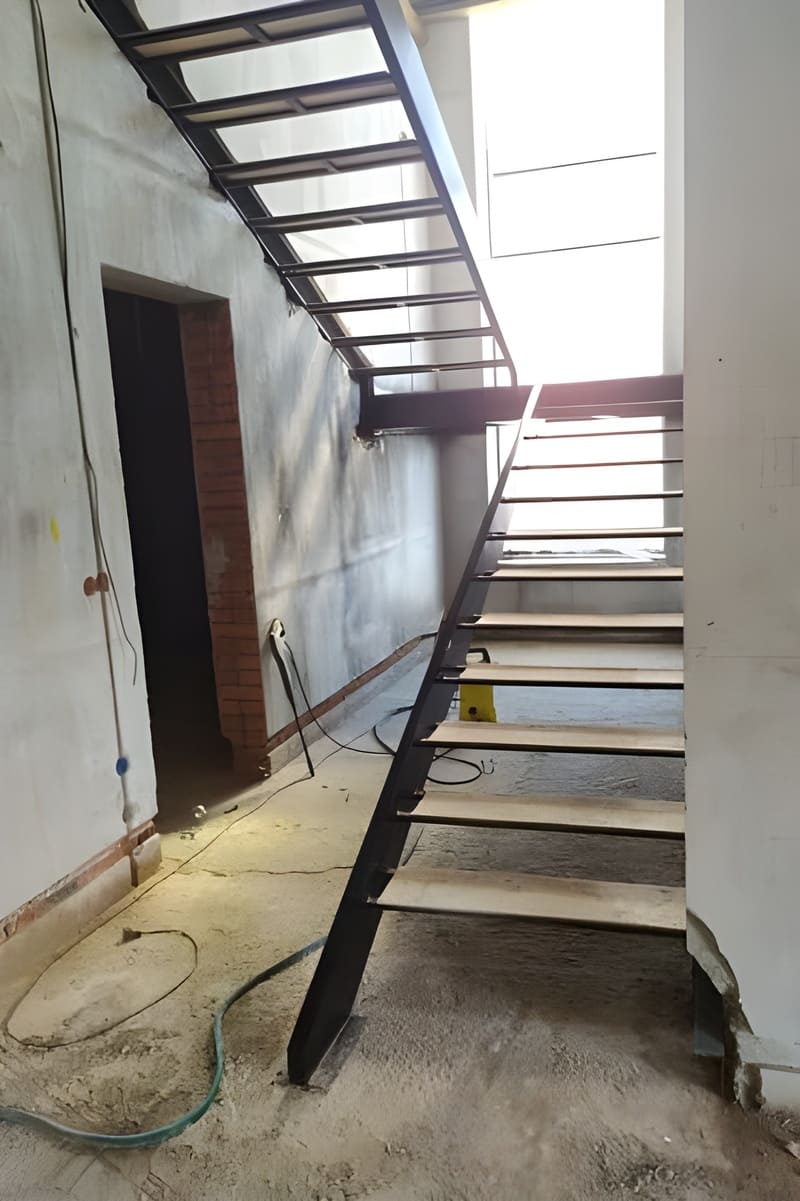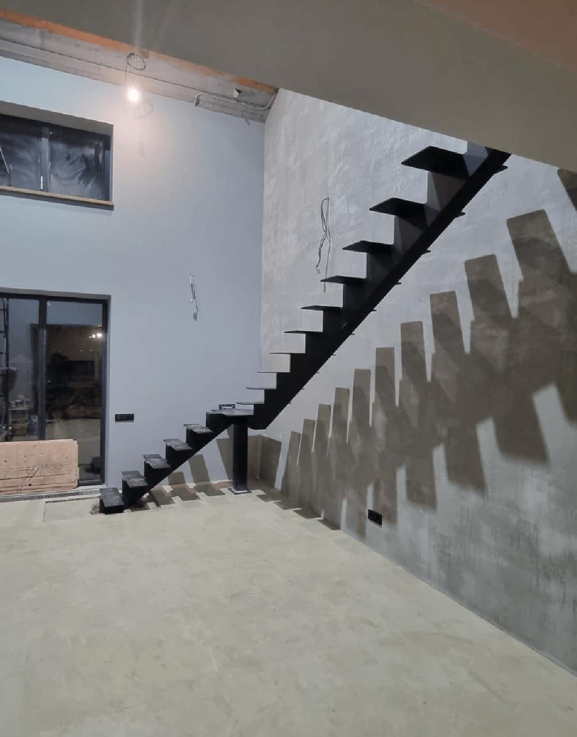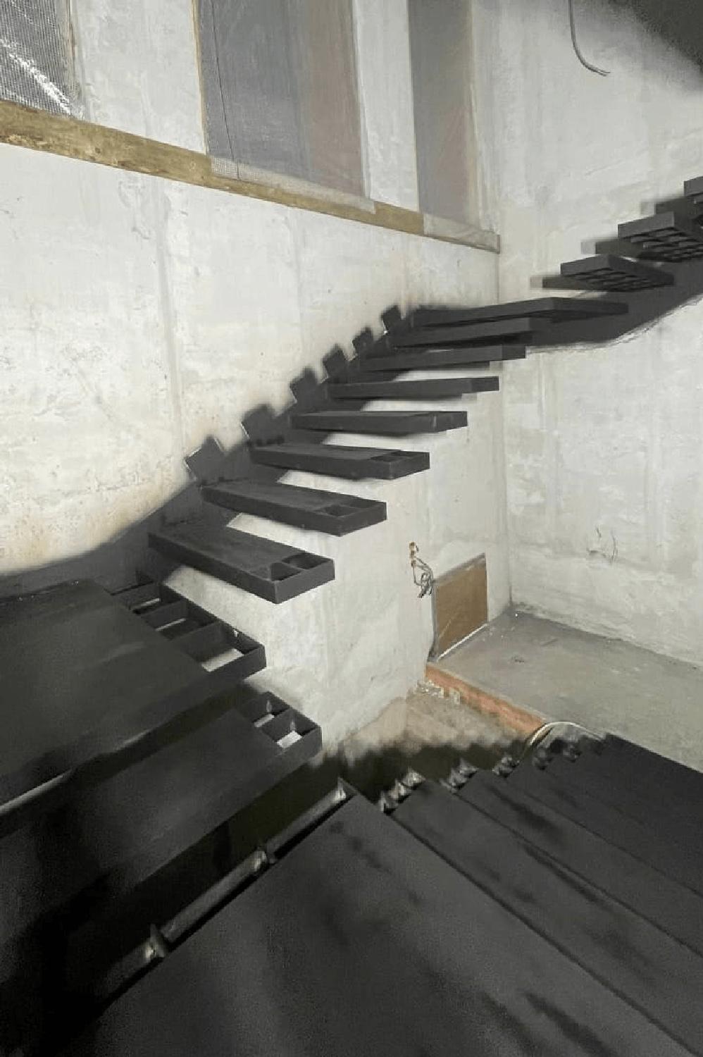 Металлический каркас лестницы открытого типа на монокосоуре из листа металла.