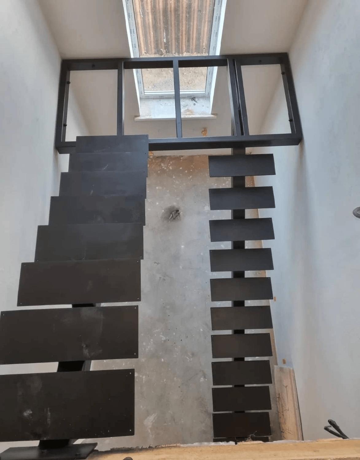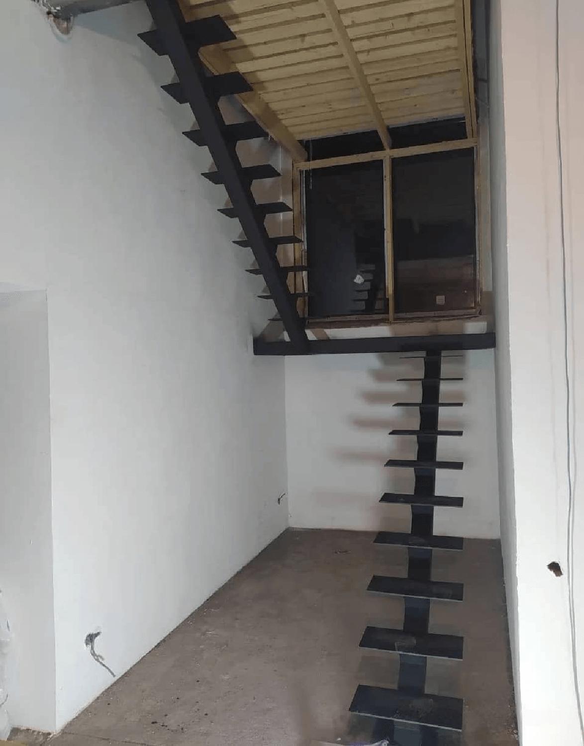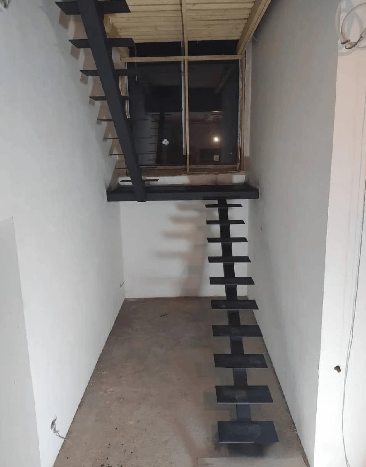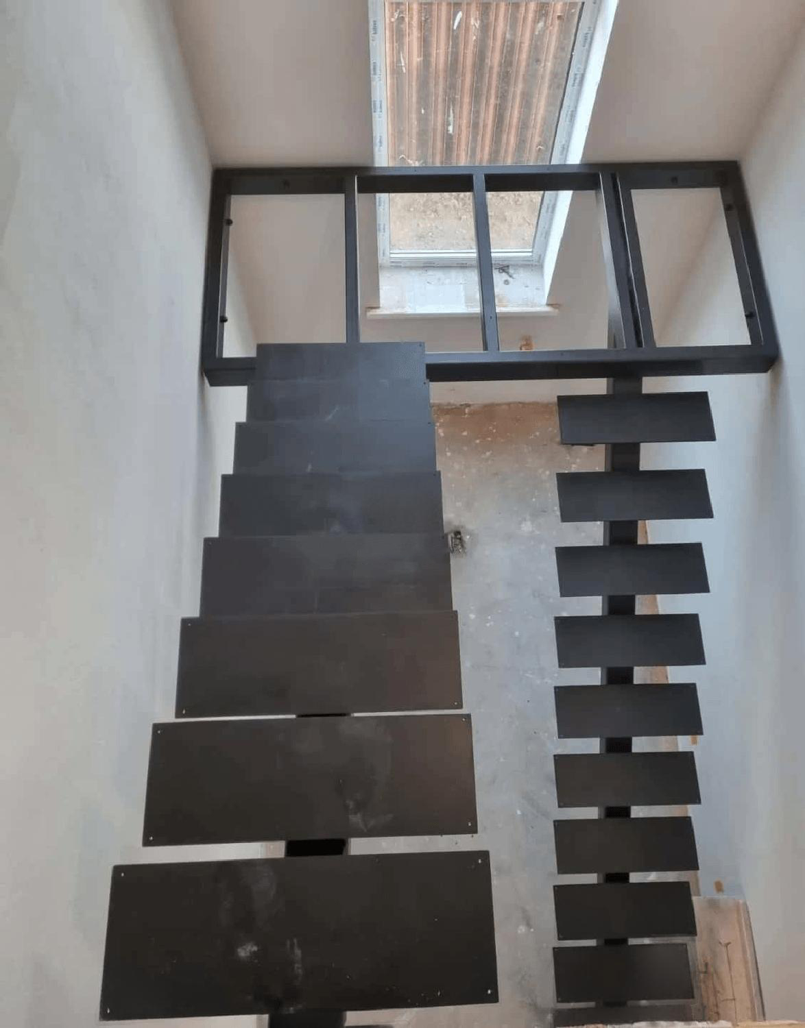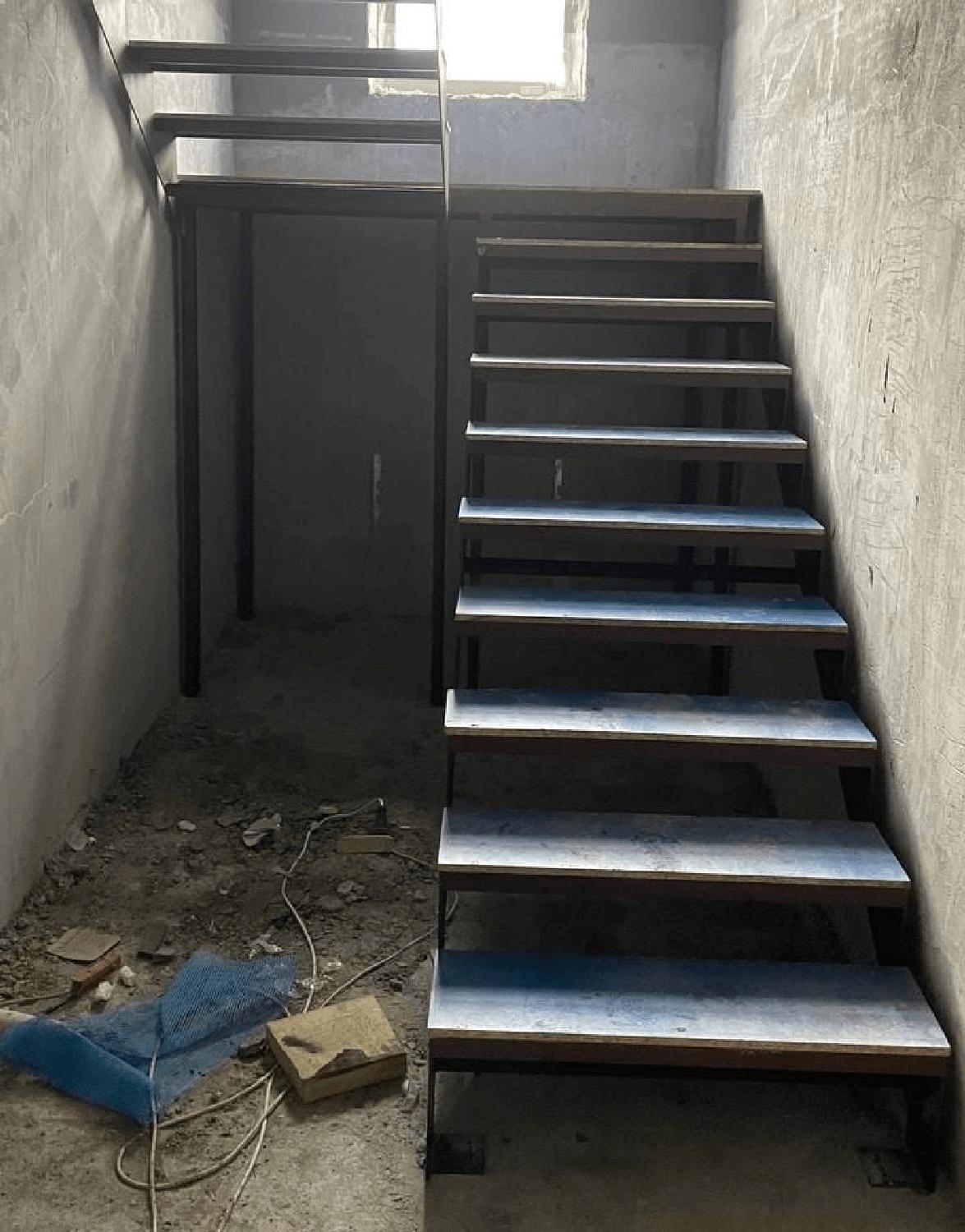Металлический каркас лестницы открытого типа на тетиве из листа металла.
