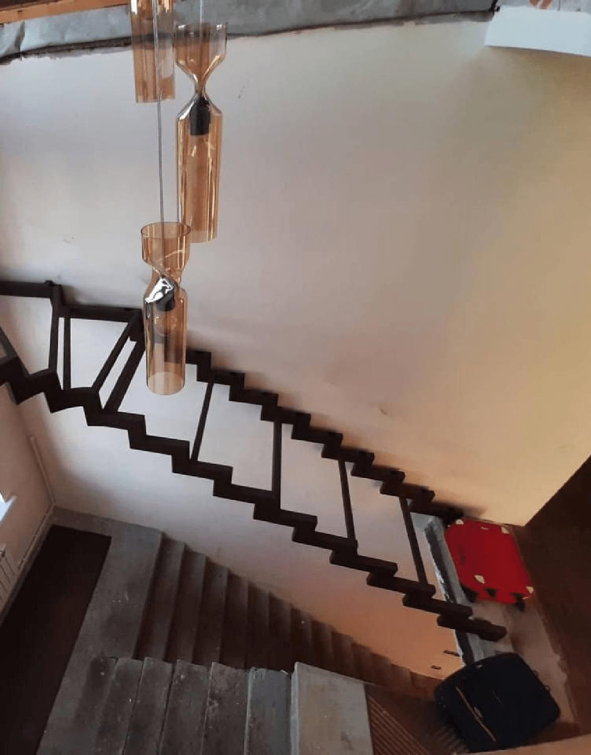Лестница Г-образная с забежными ступенями, длинный верхний марш.