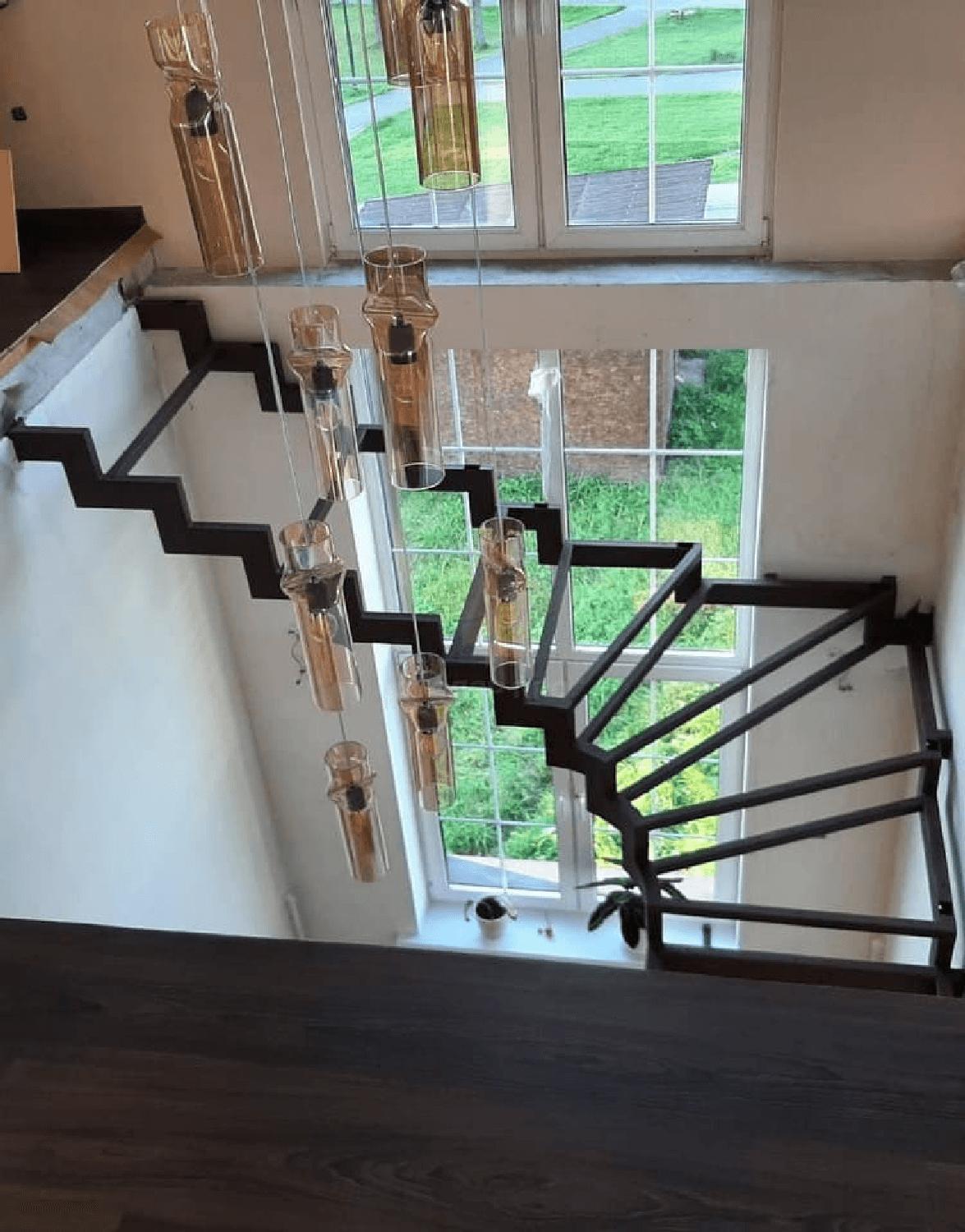 Г-образный с длинным верхним маршем и площадкой при выходе на второй этаж.