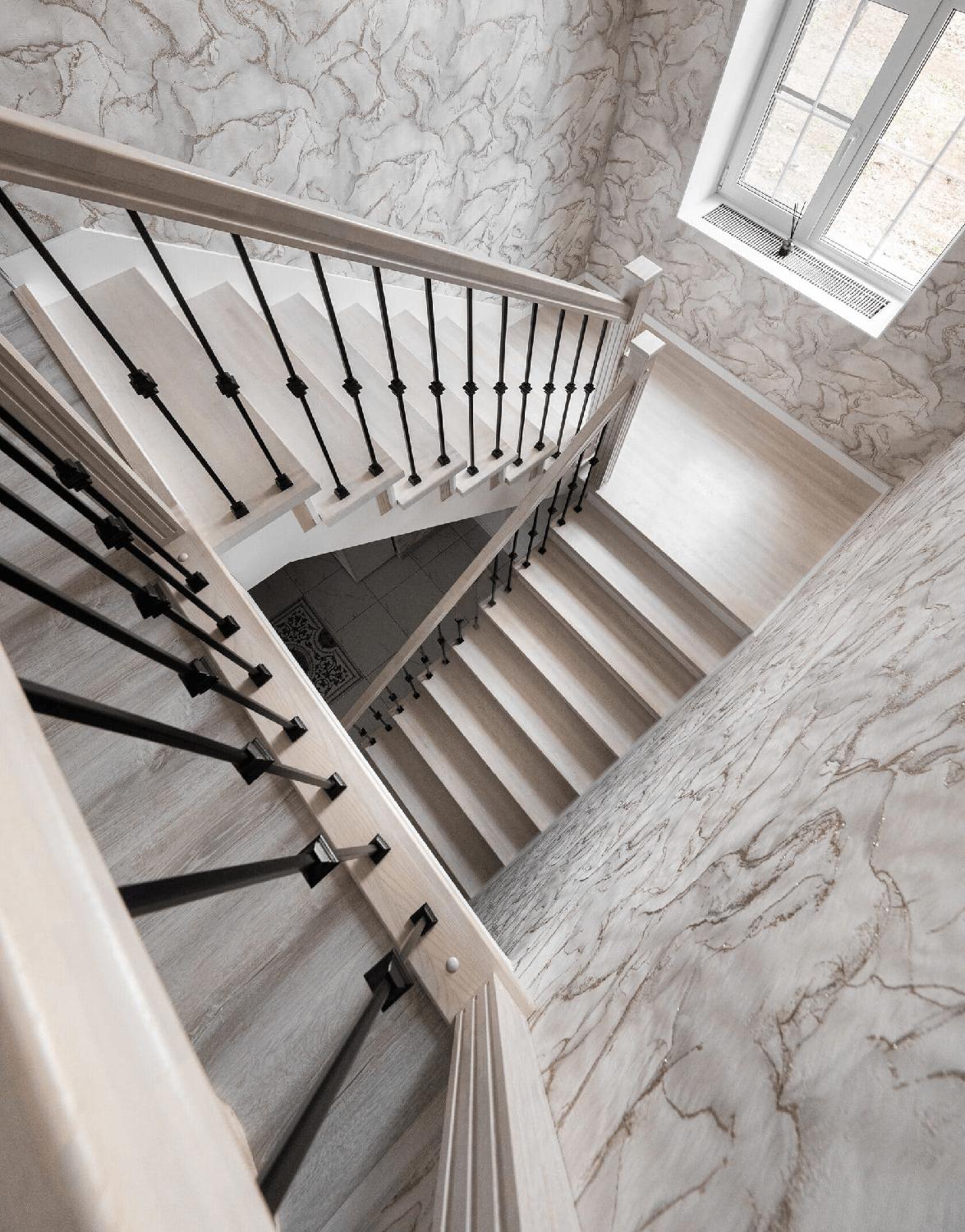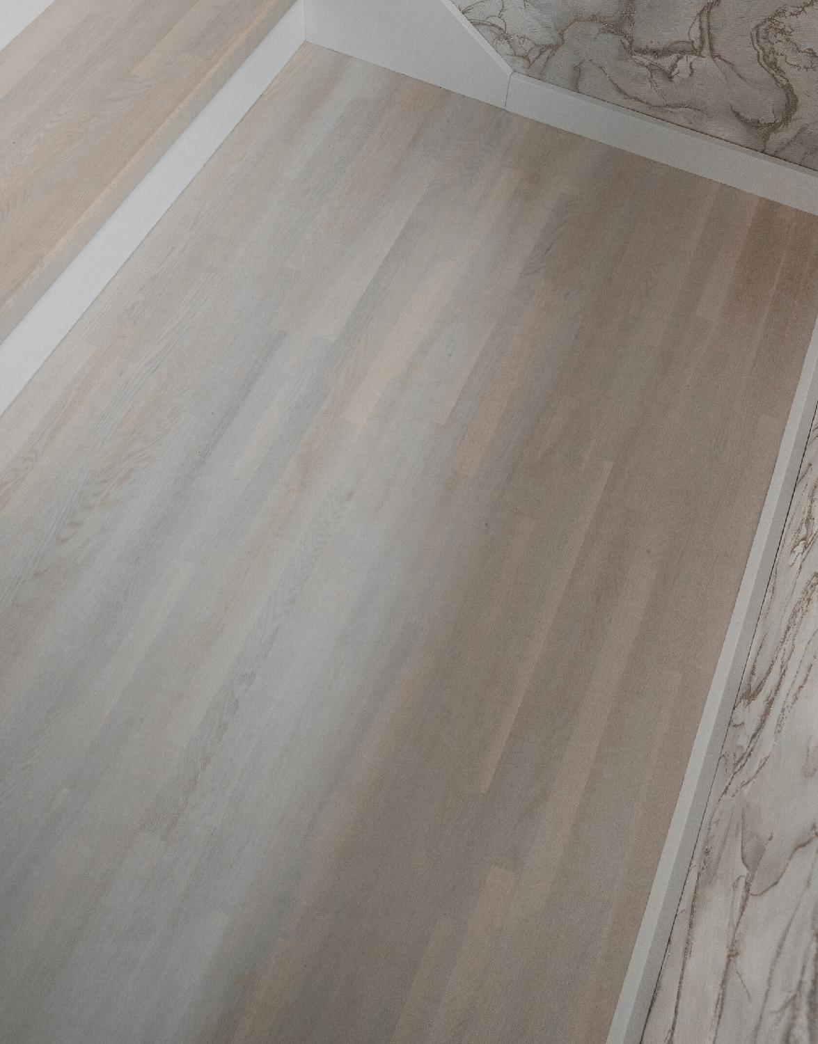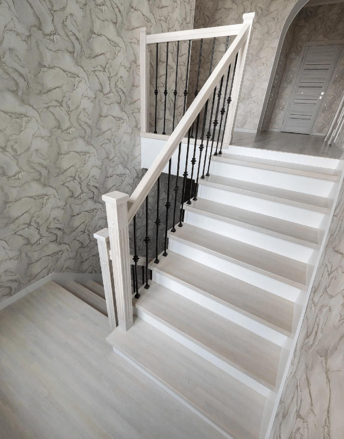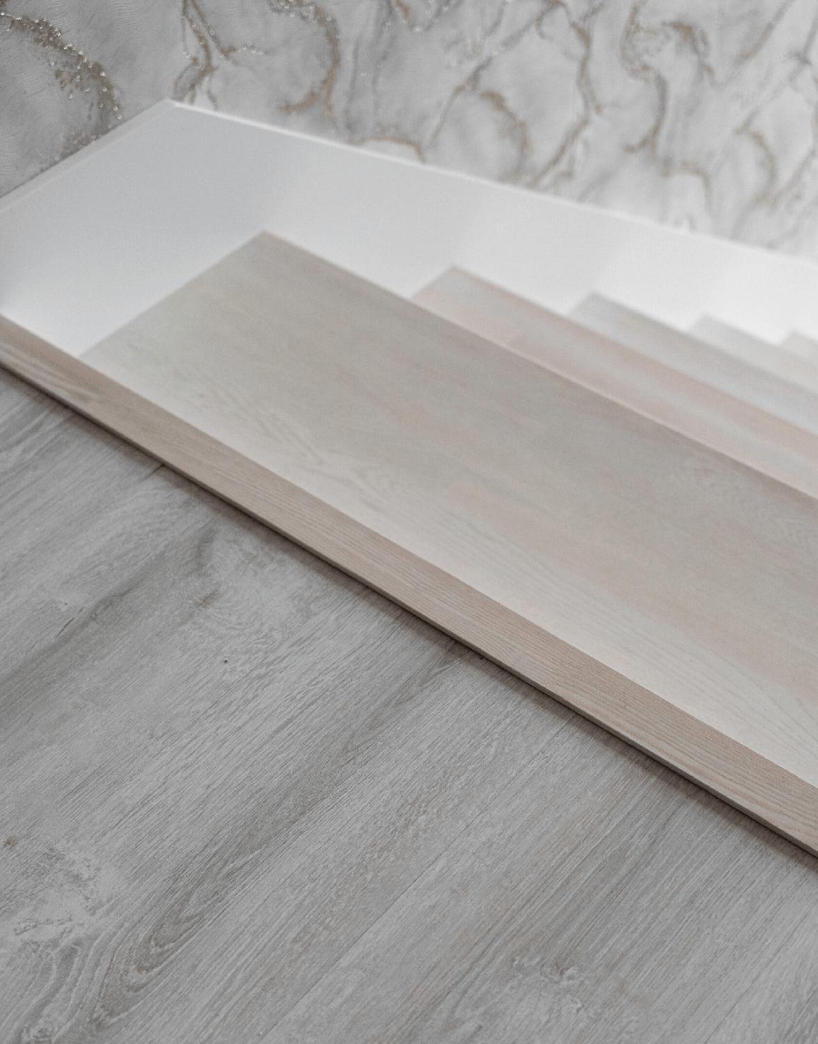 Облицовка бетонной лестницы беленым дубом с доп ступенью на полу