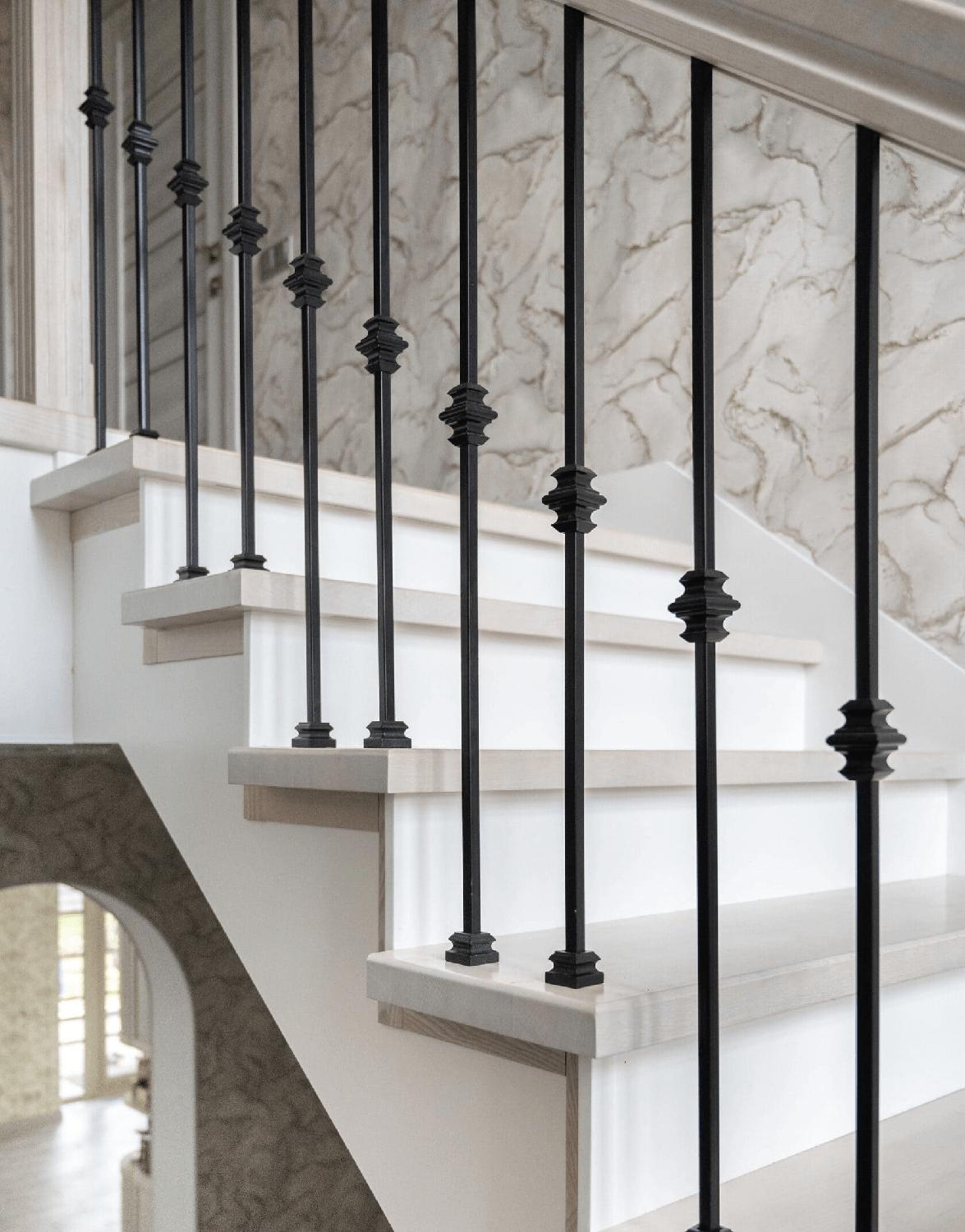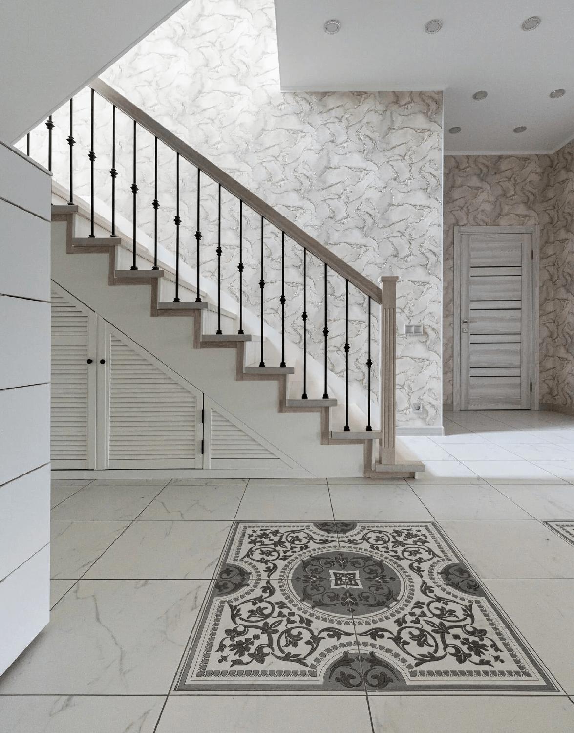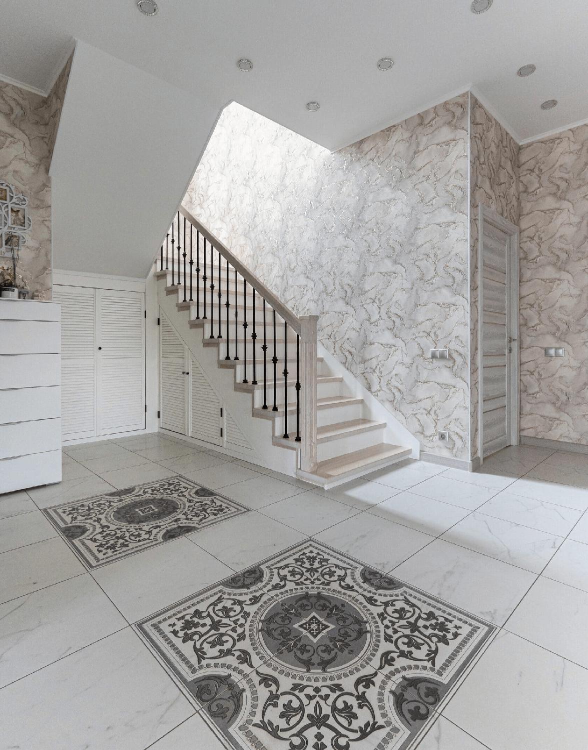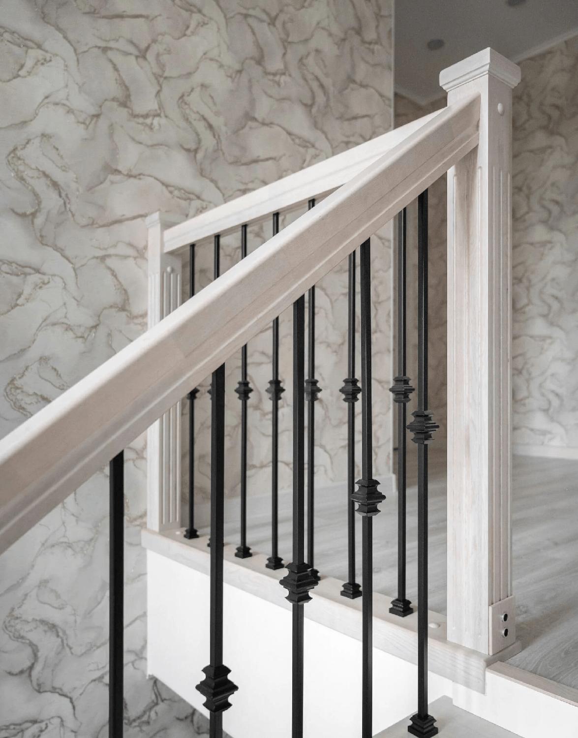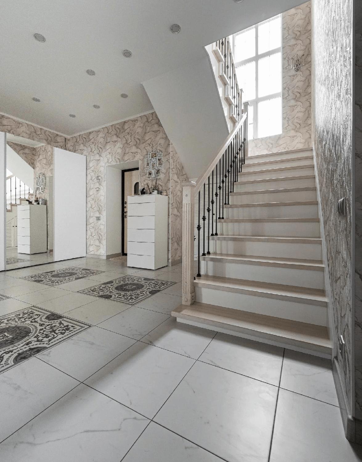 Облицовка бетонной лестницы беленым дубом с доп ступенью на полу