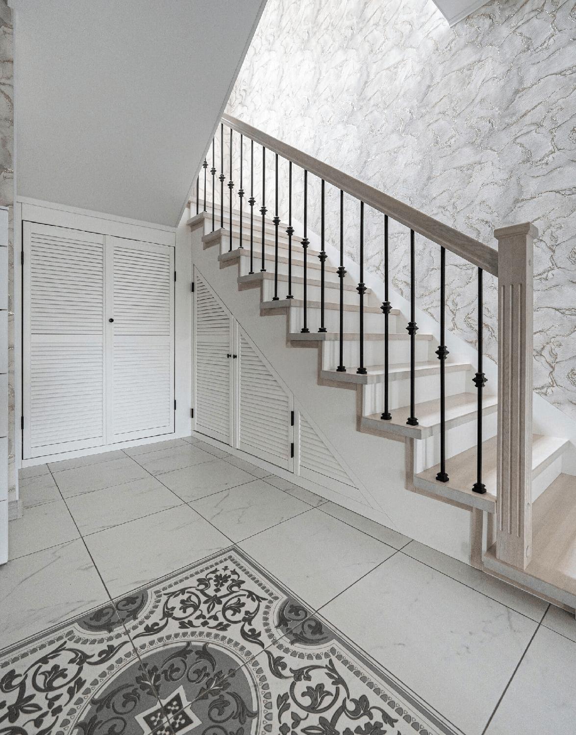 Обшивка бетонного каркаса сращенным дубом. Подступенки и плинтус из МДФ. Первая ступень на бетоне была высокая, поэтому добавили нулевую на полу. Под лестницей сделали кладовку с жалюзийными дверками. Под ступенями подсветка