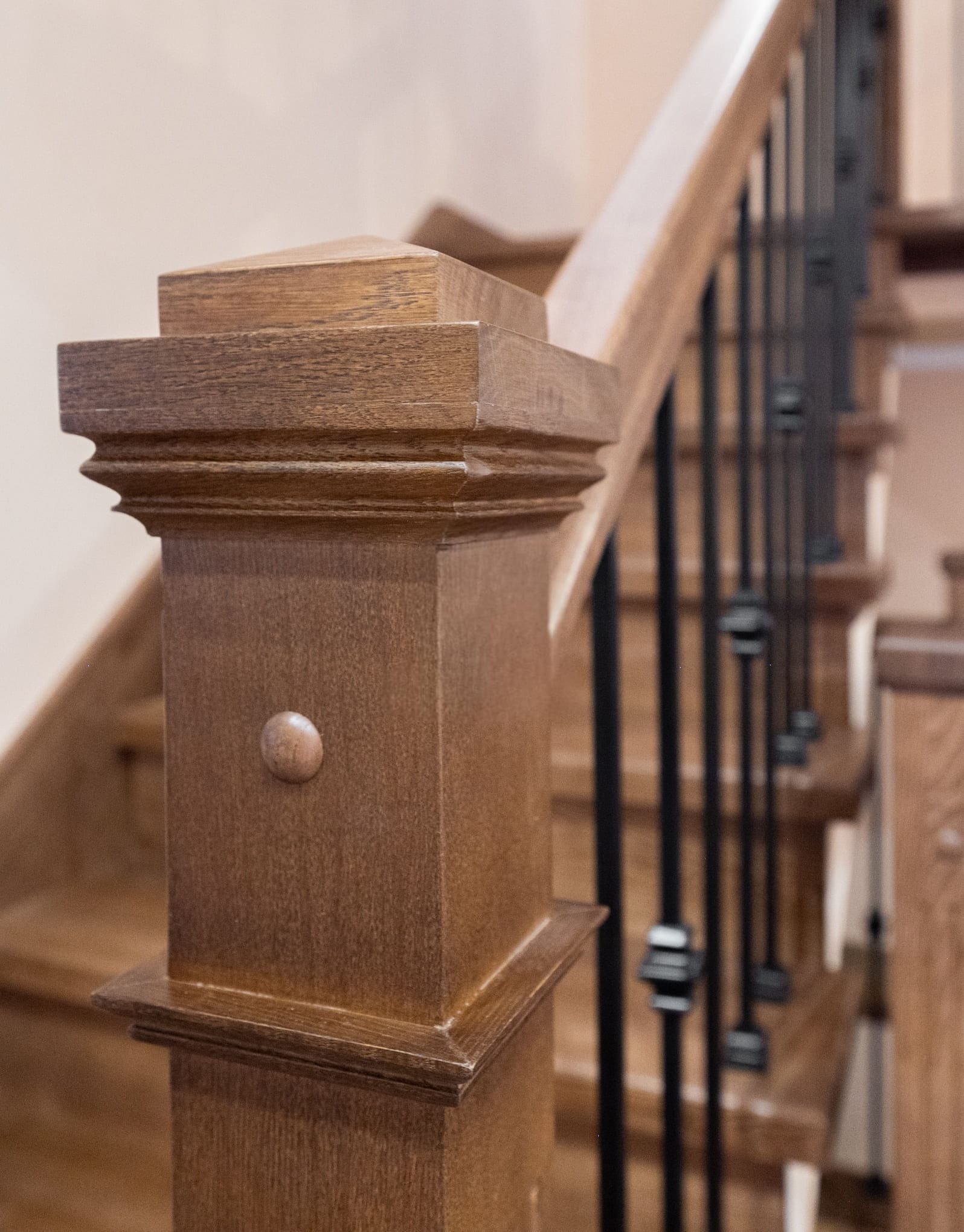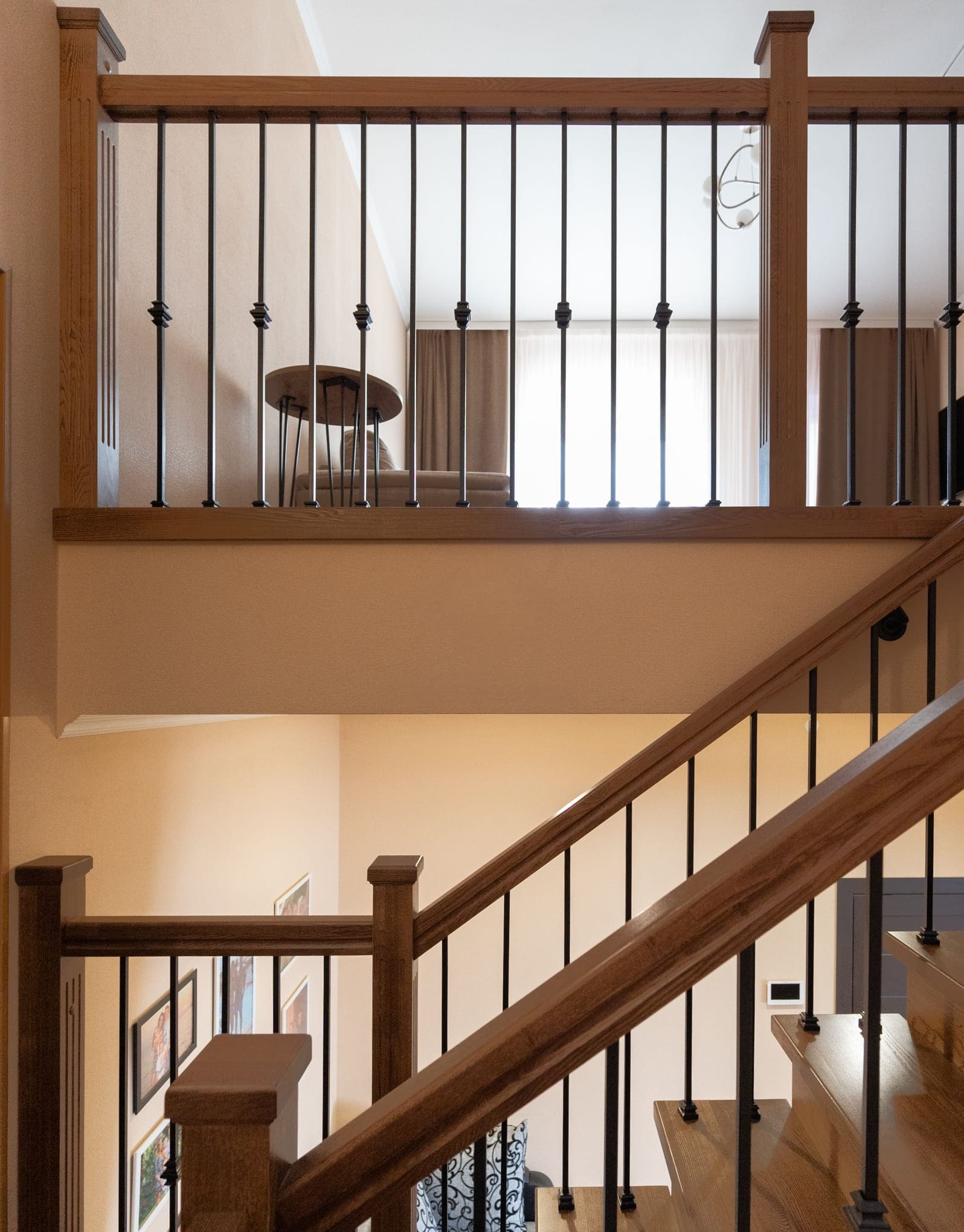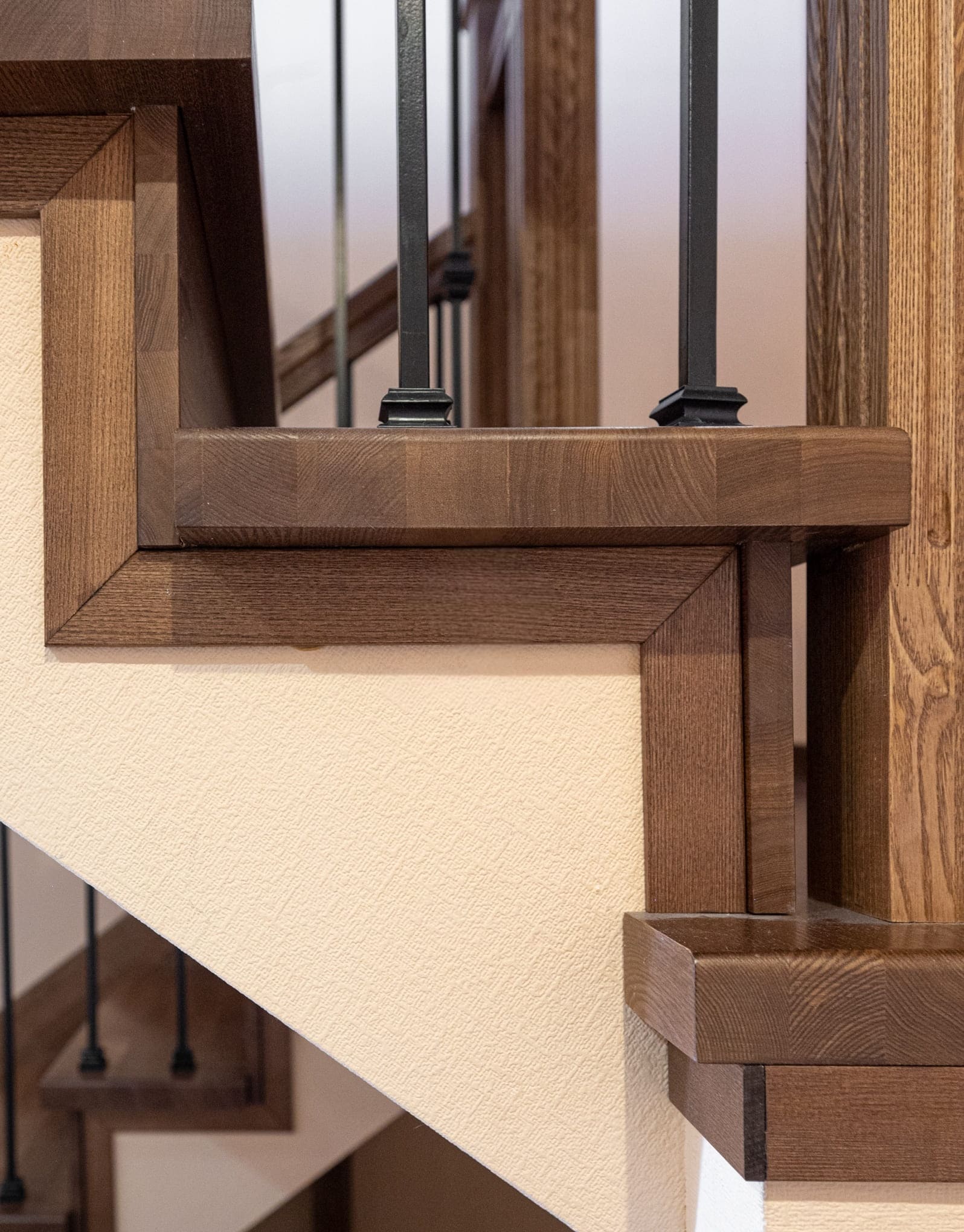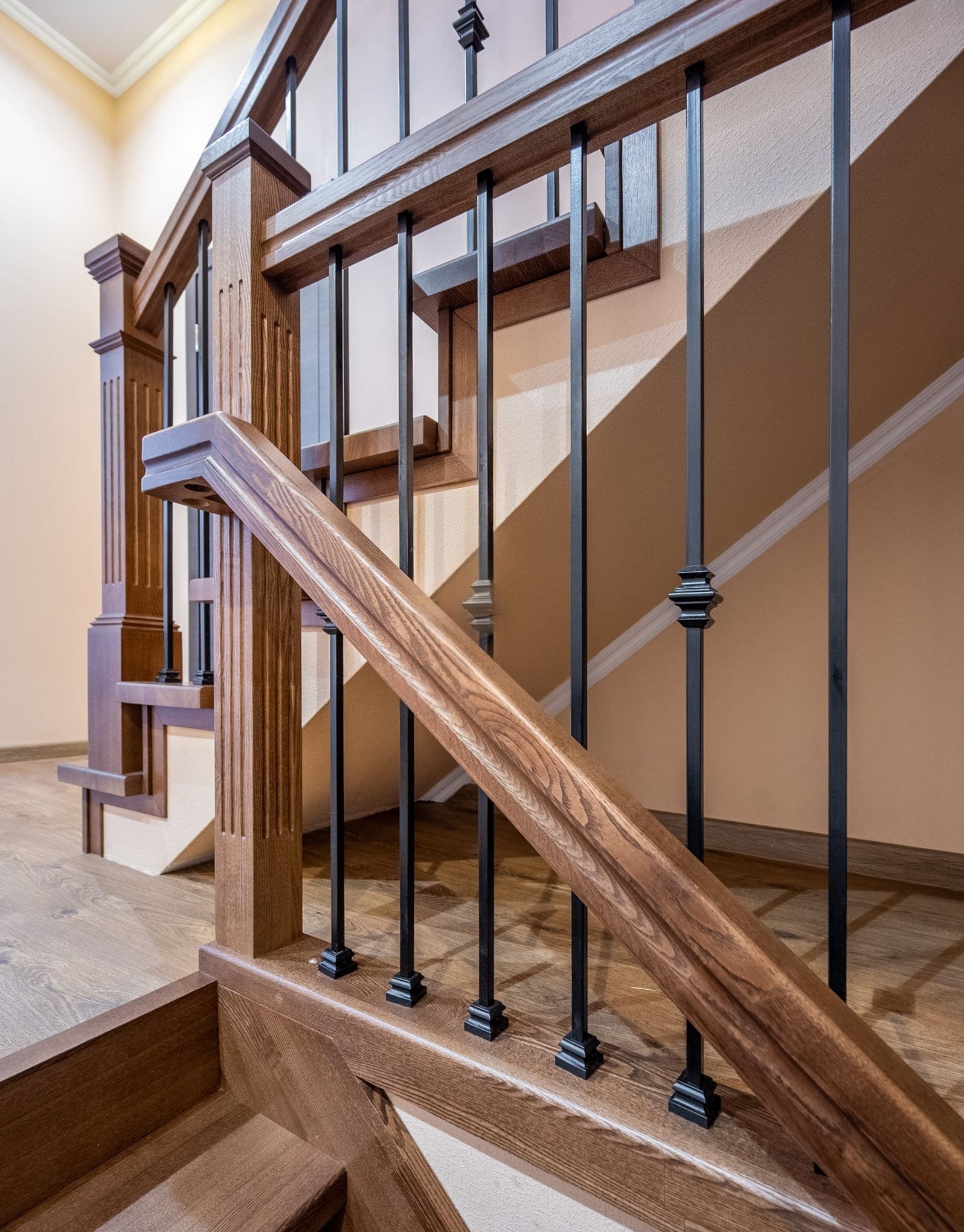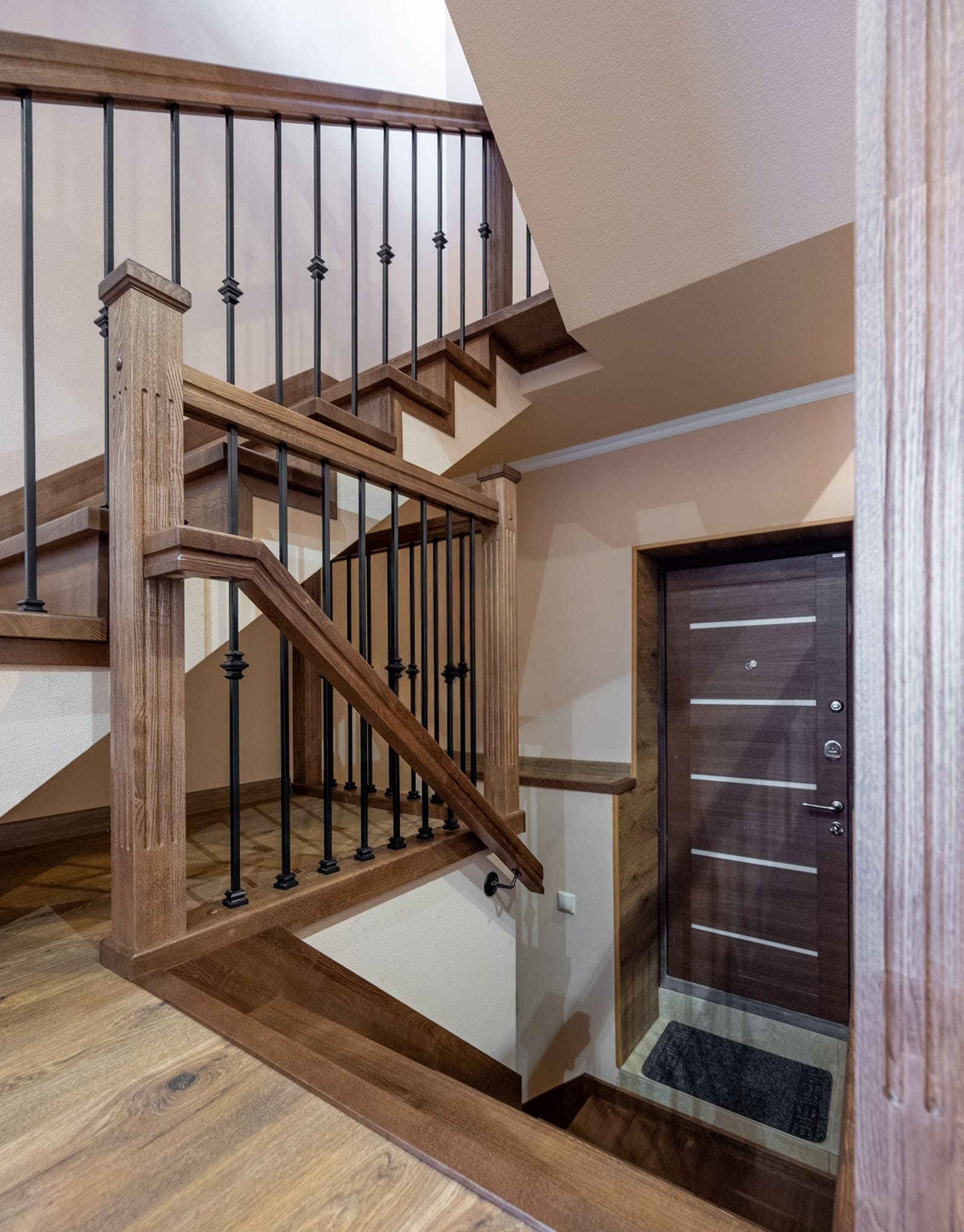 Обшивка металлокаркаса лестницы дубом с ограждением из металла