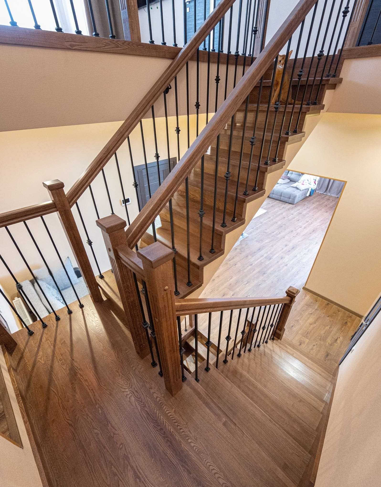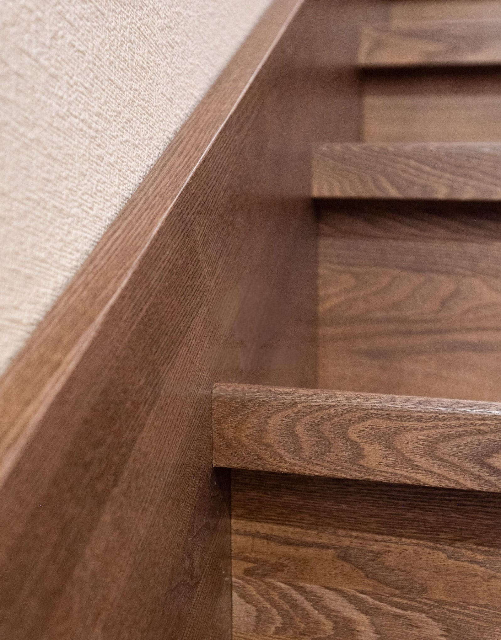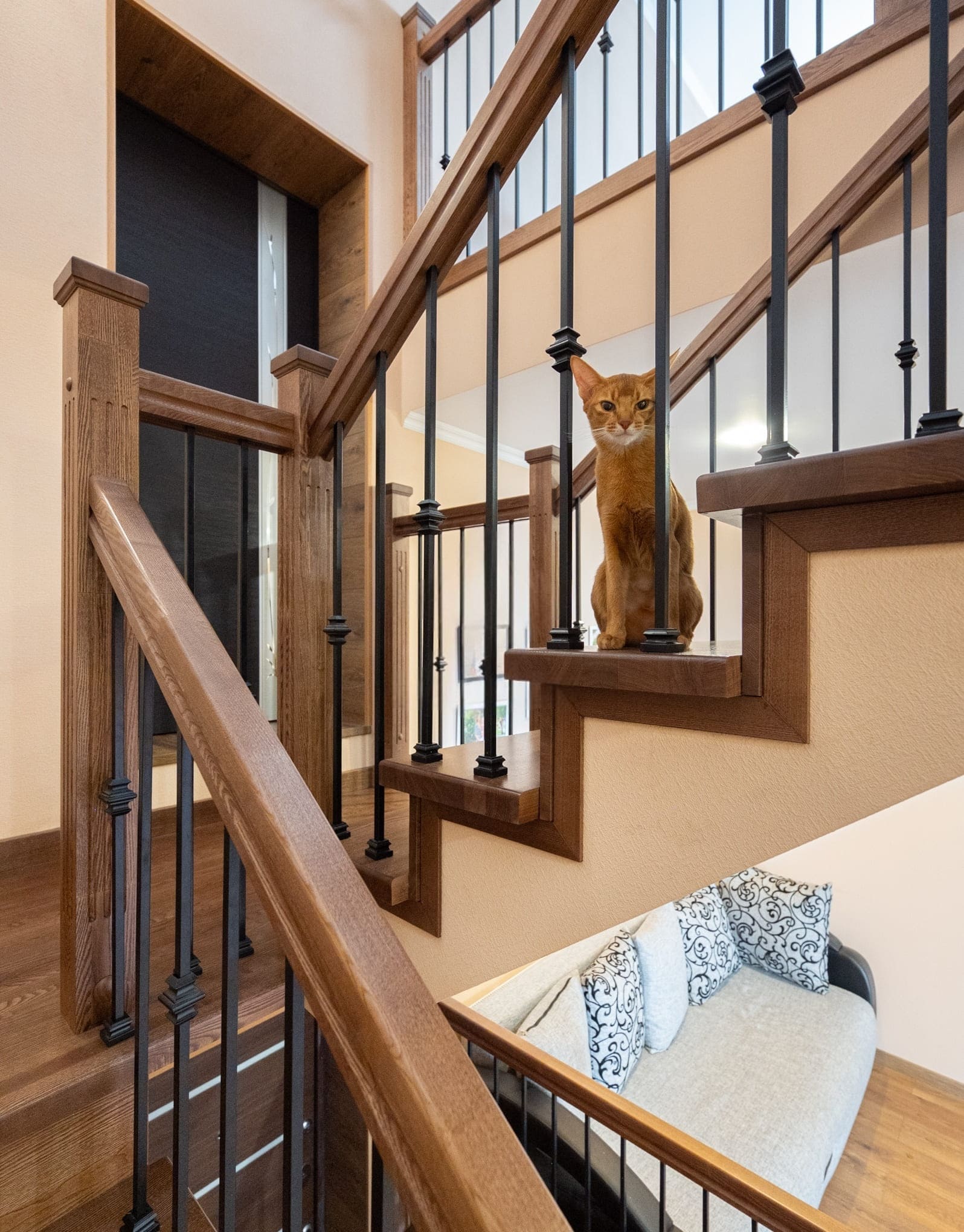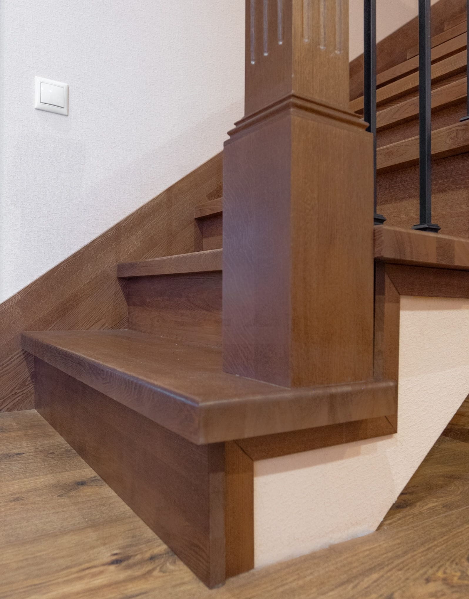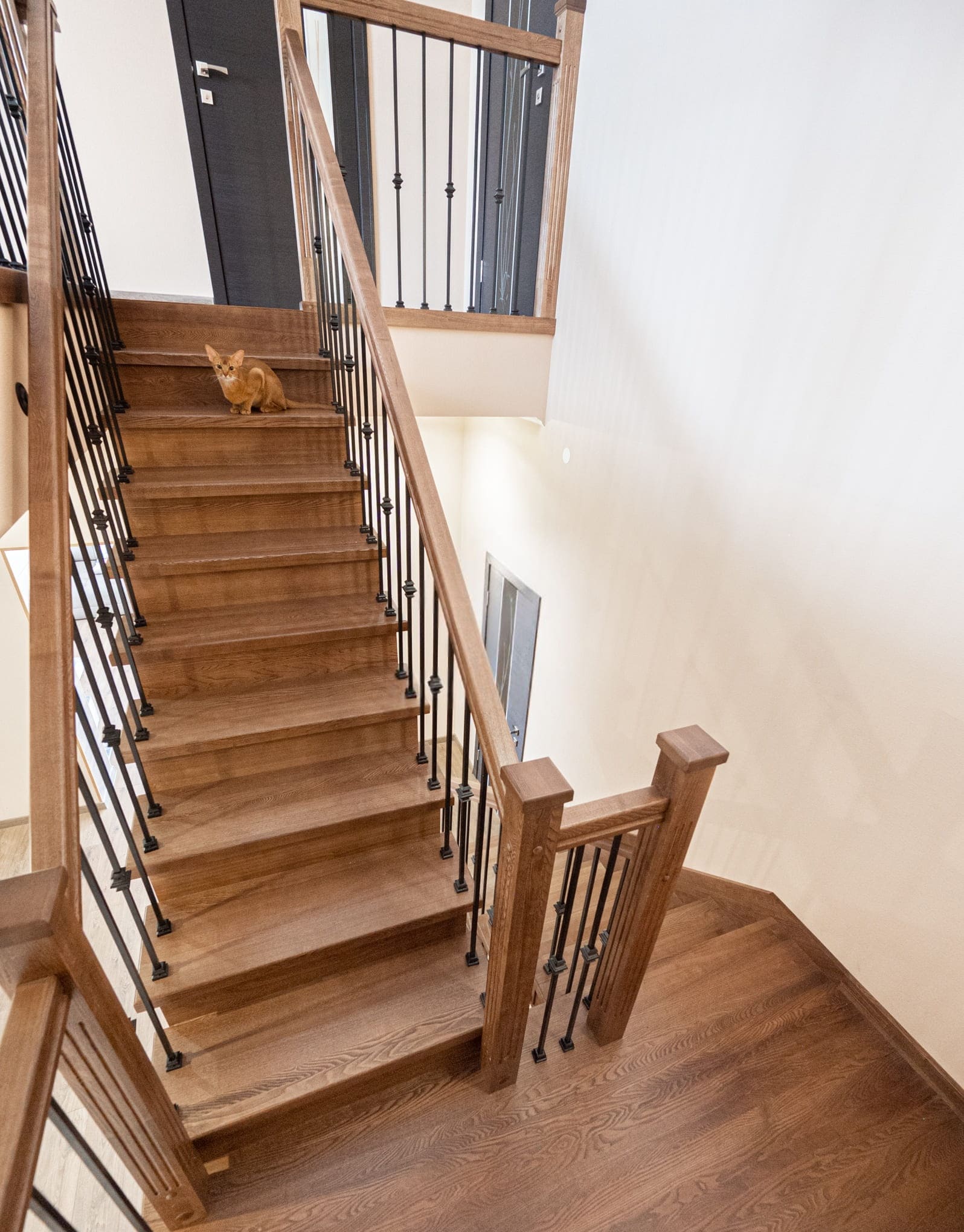Лестница на металлическом каркасе с первого на второй и небольшая в цокольный этаж. Ступени, подступенки и фальштетива из цельноламельного дуба. Ограждение с металлическими балясинами