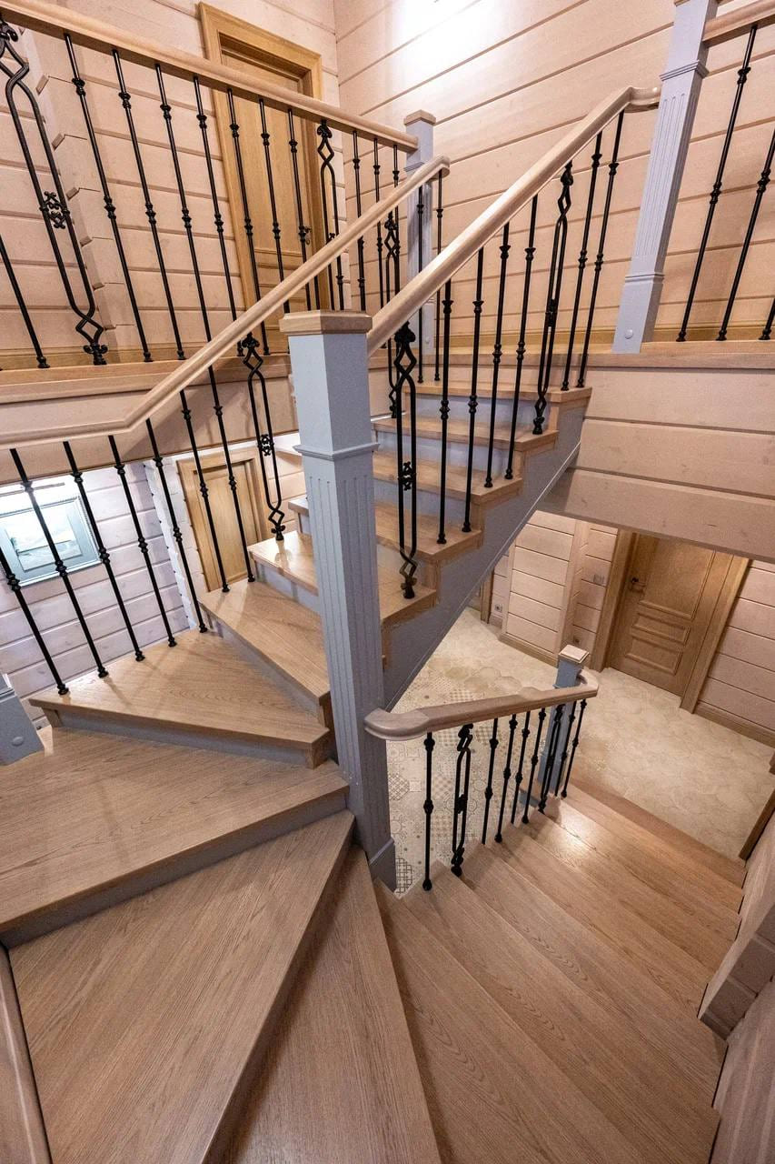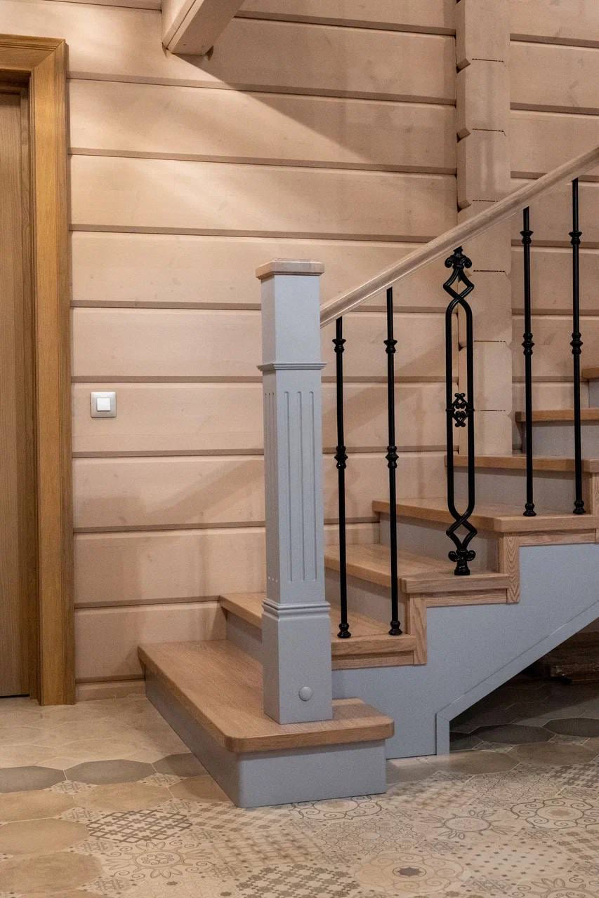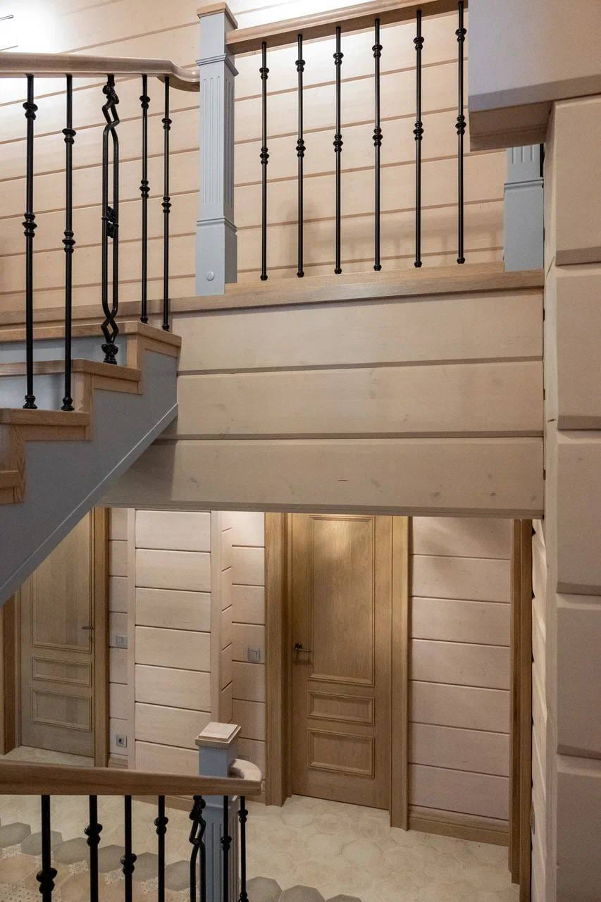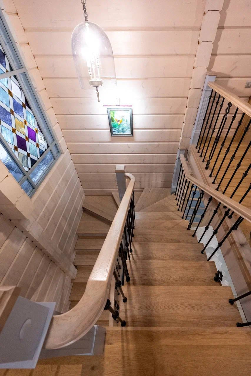 Лестница на металлокаркасе. Ступени шпонированные дубом, подступенки, торец и низ из МДФ. Все столбы широкие с основанием 125 мм, в том числе центральный. Балясины не кованые, а литые. Каркас обшиваем снизу без кладовки