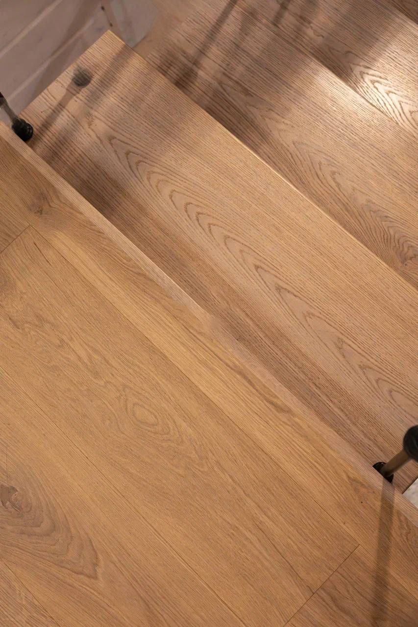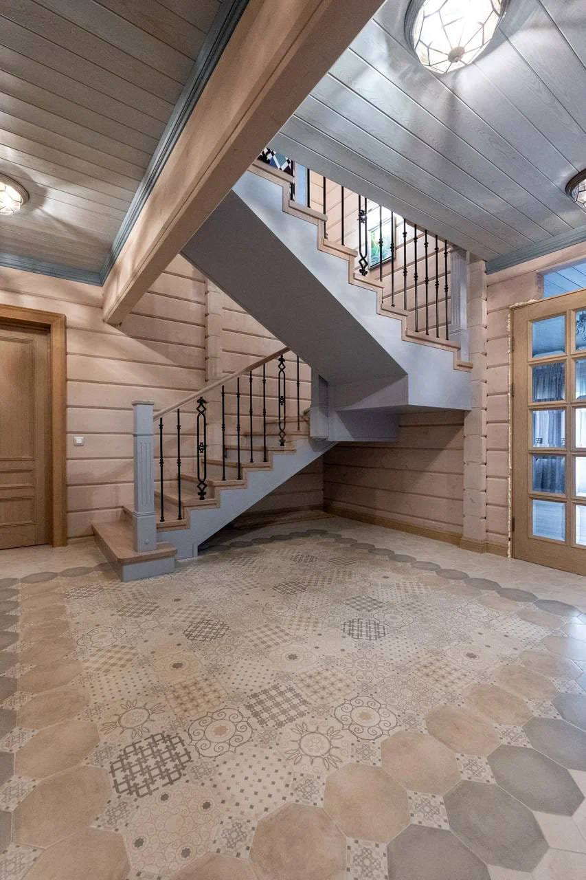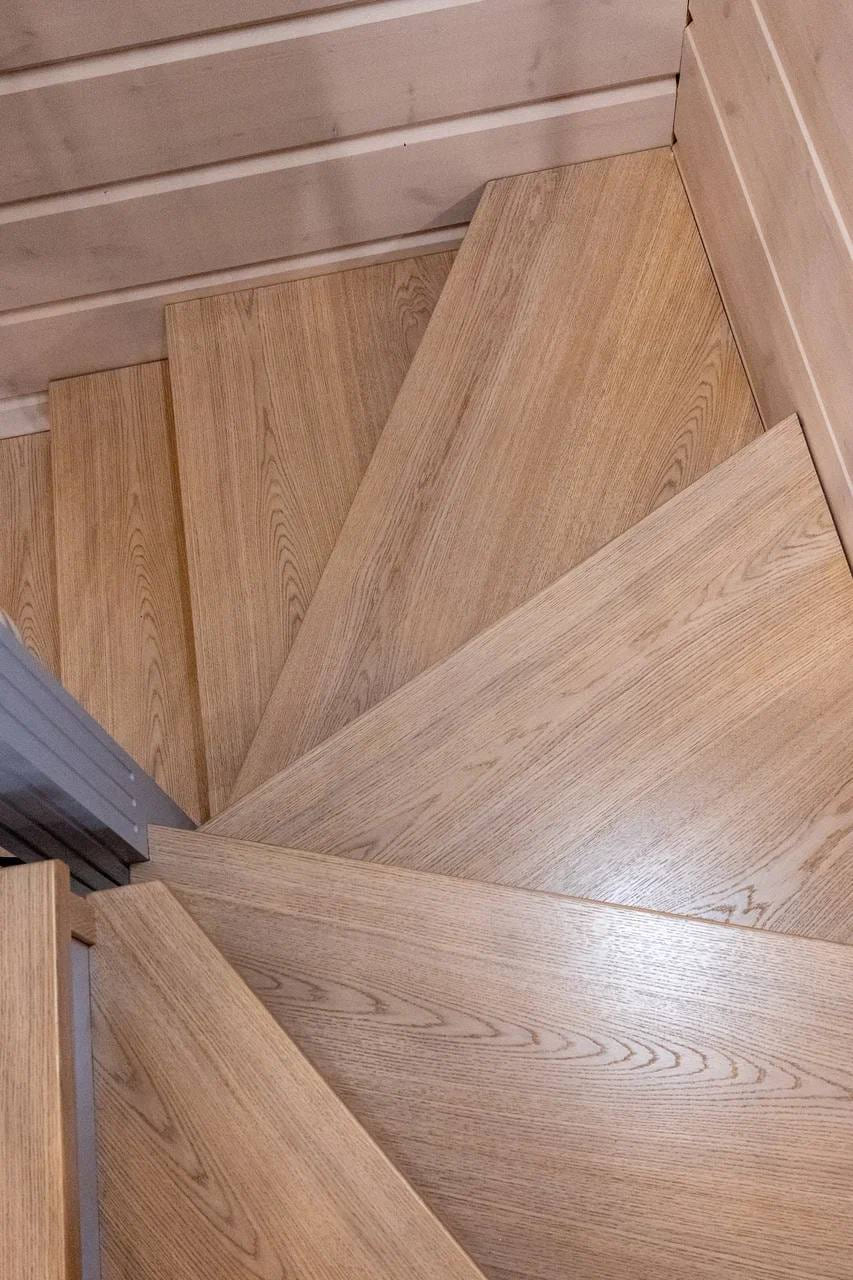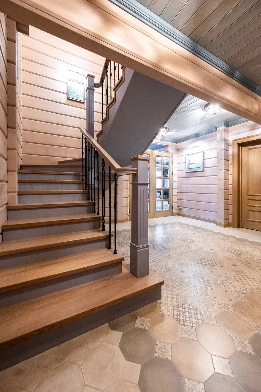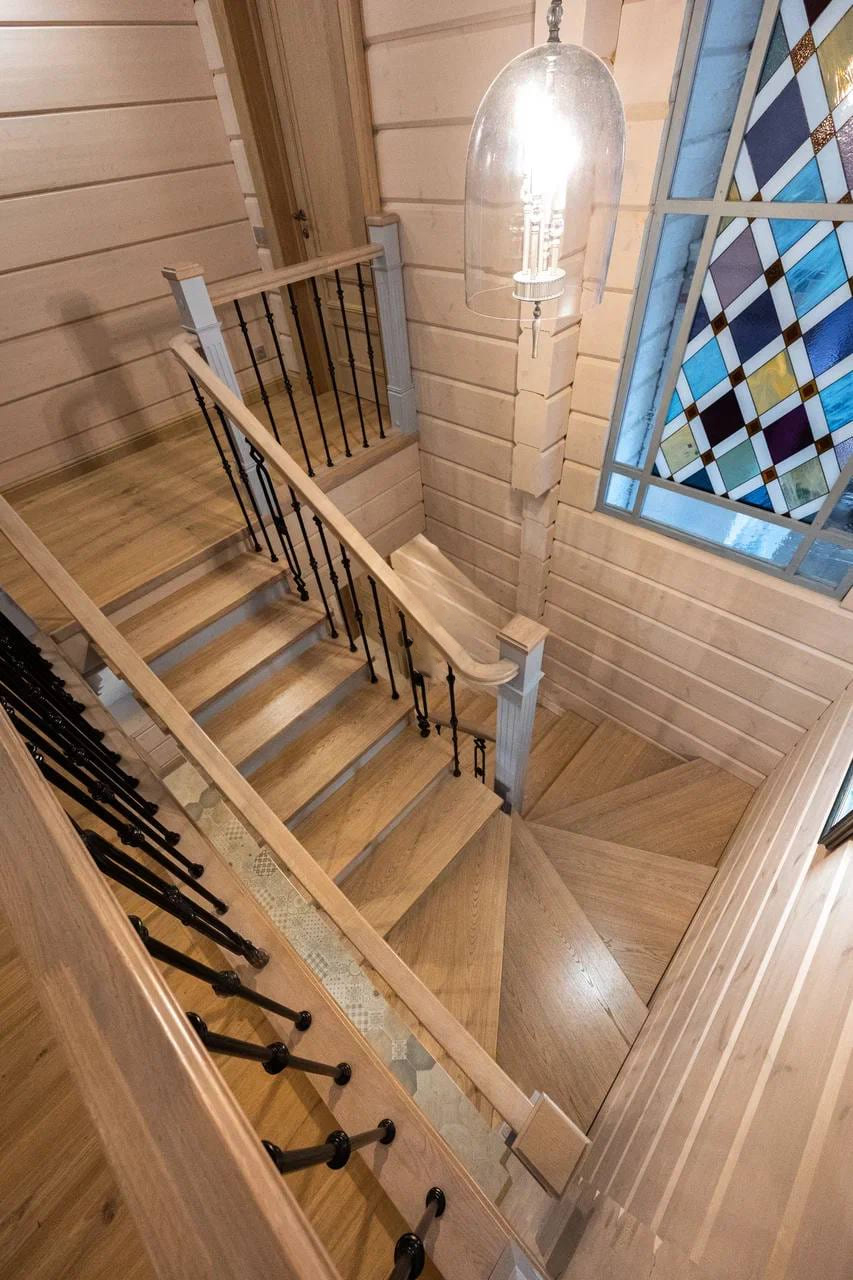 Лестница на металлокаркасе. Ступени шпонированные дубом, подступенки, торец и низ из МДФ. Все столбы широкие с основанием 125 мм, в том числе центральный. Балясины не кованые, а литые. Каркас обшиваем снизу без кладовки