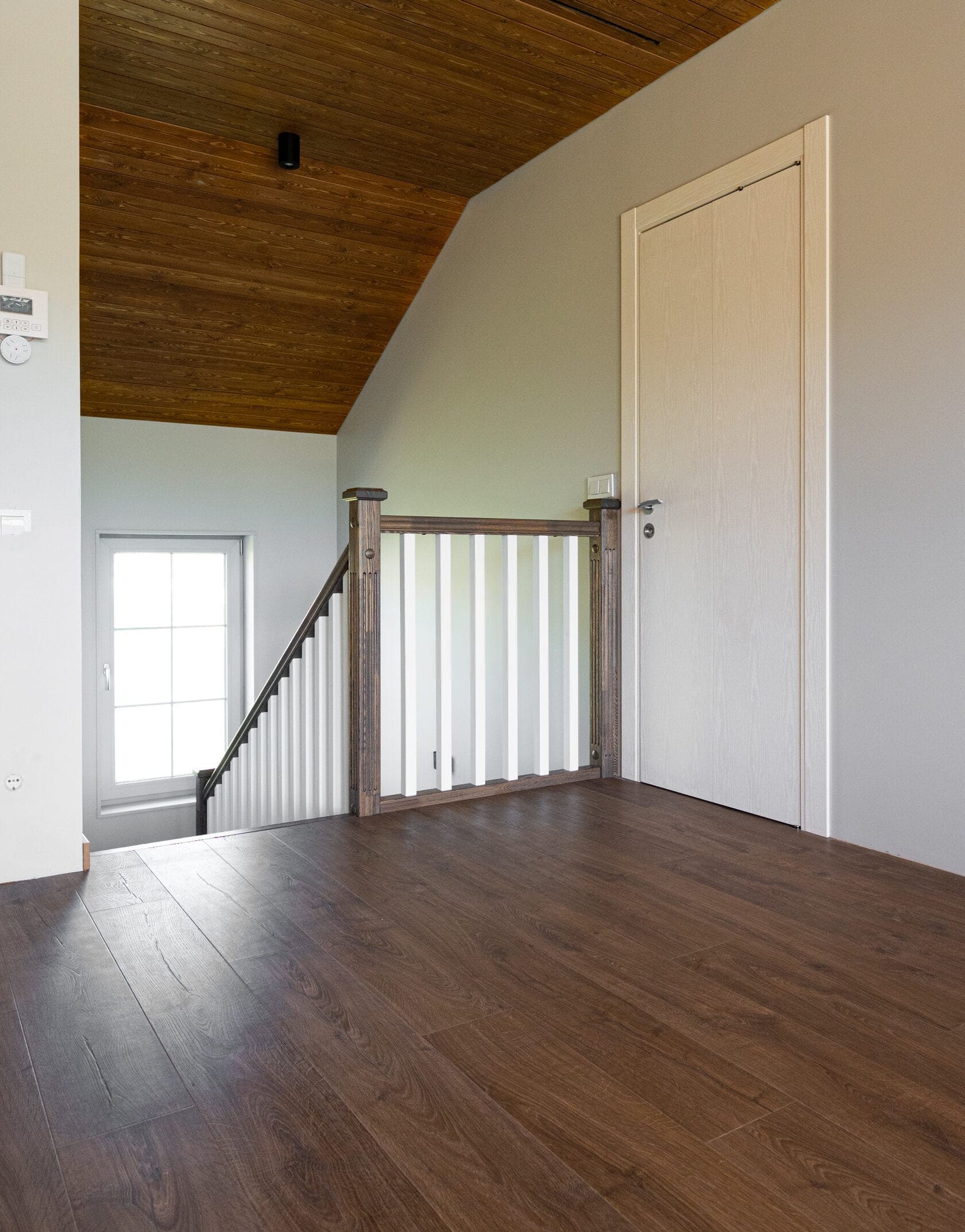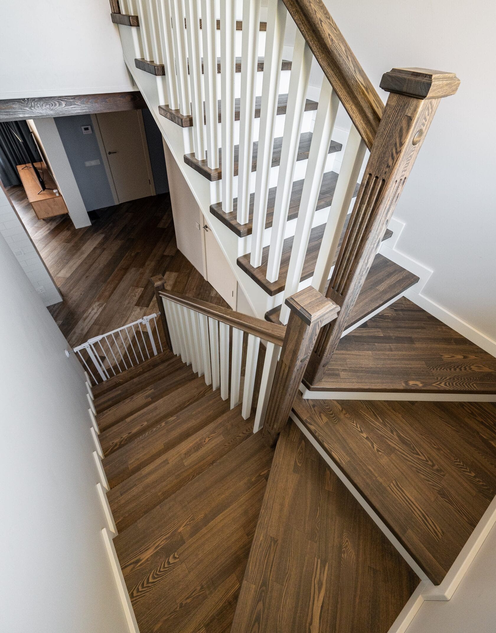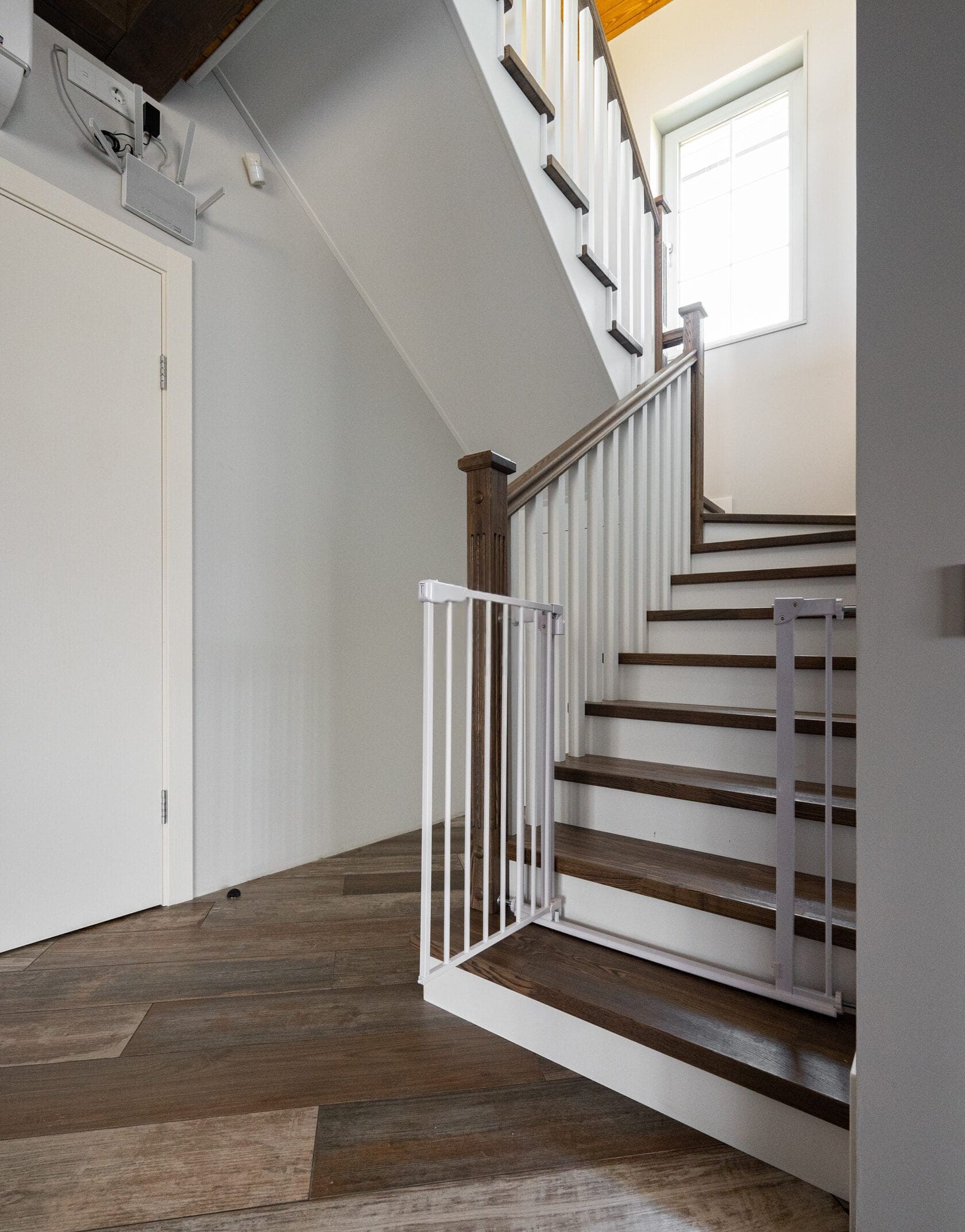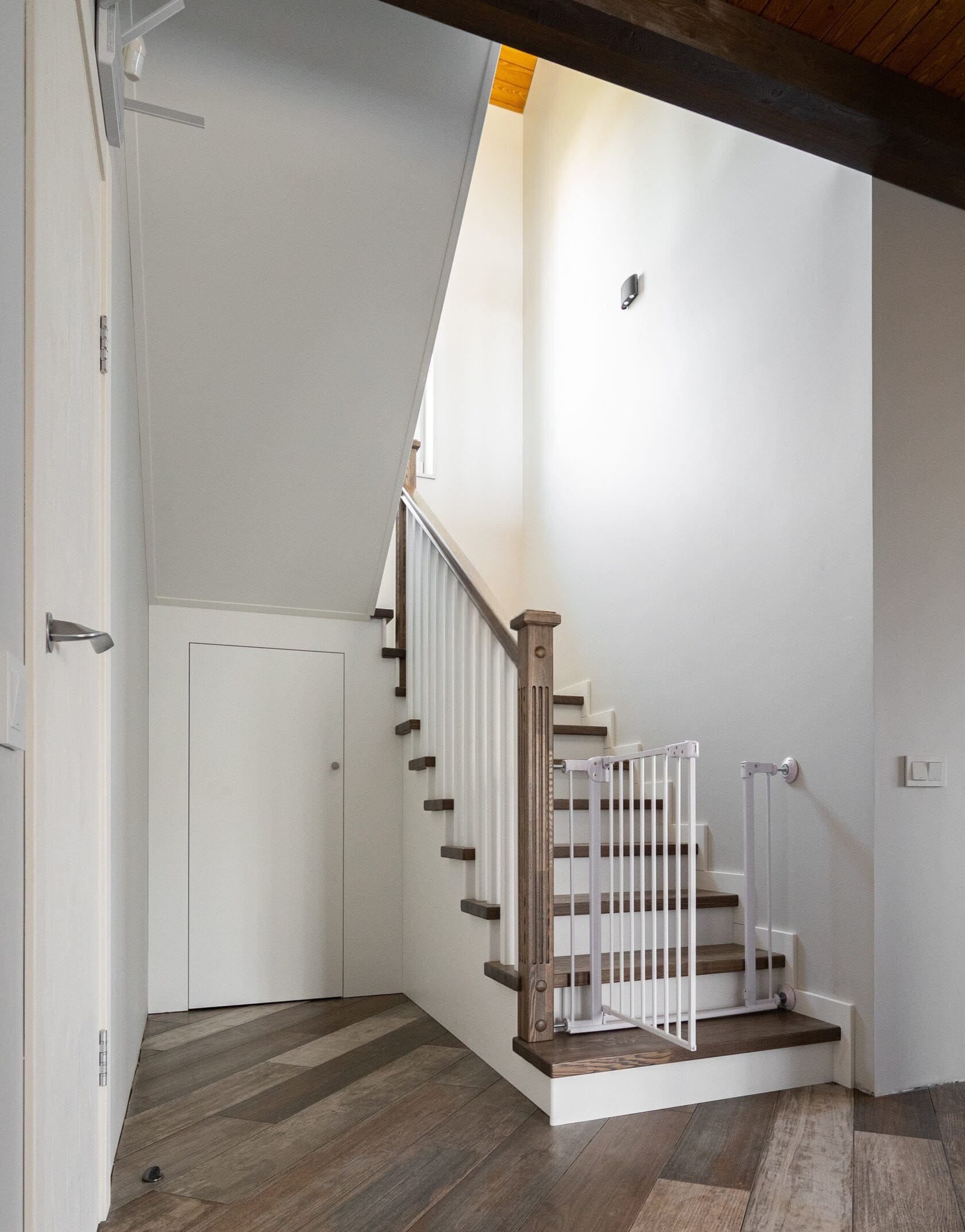 Обшивка металлического каркаса сращенным ясенем. Каркас ставили мы. Подступенки и плинтус из МДФ. Ограждение с деревянными балясинами. Под лестницей сделали кладовку. Внизу лестницы детская калитка