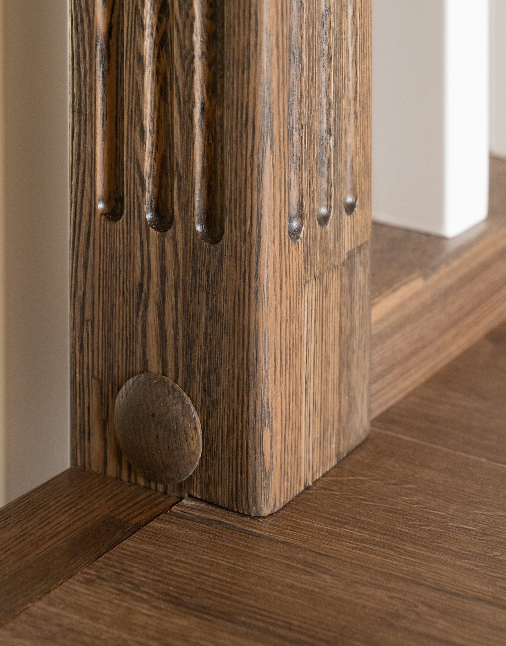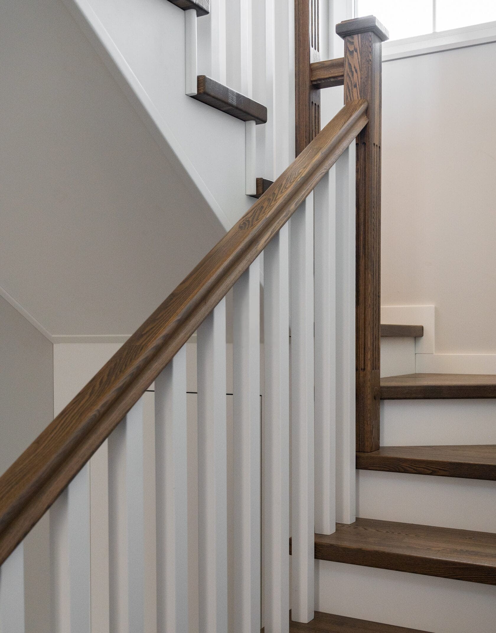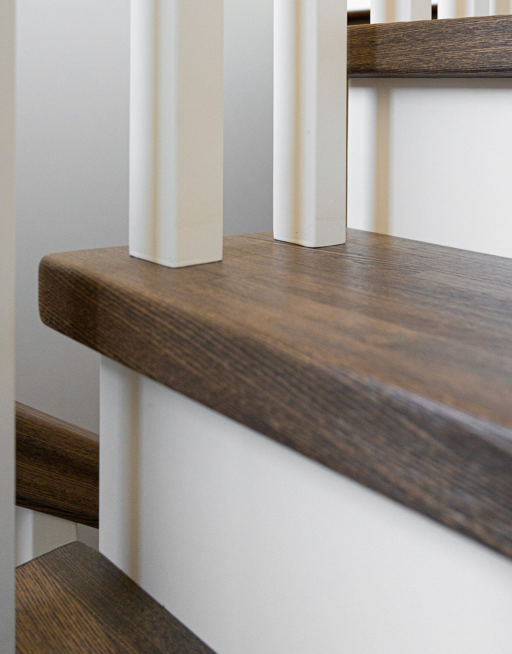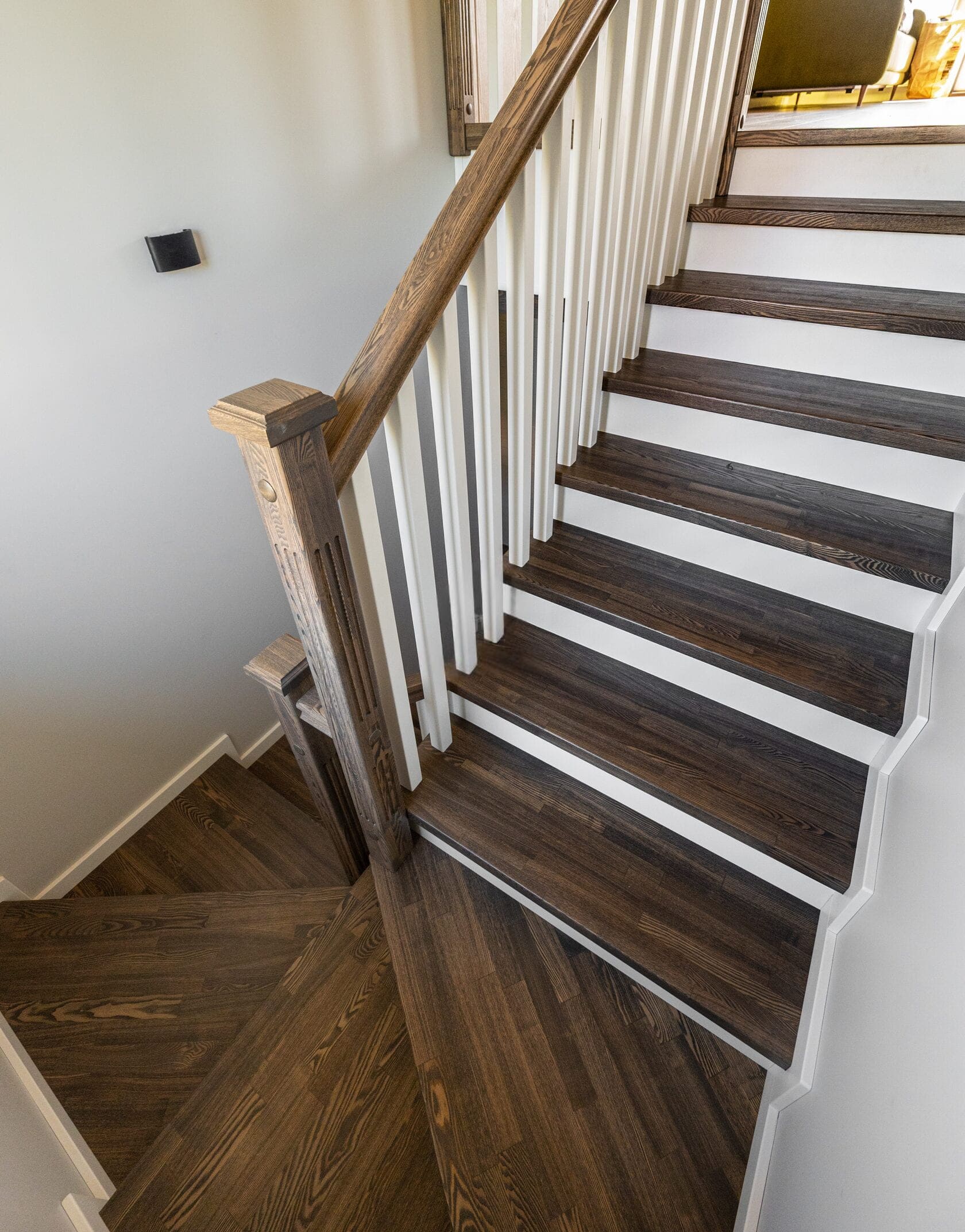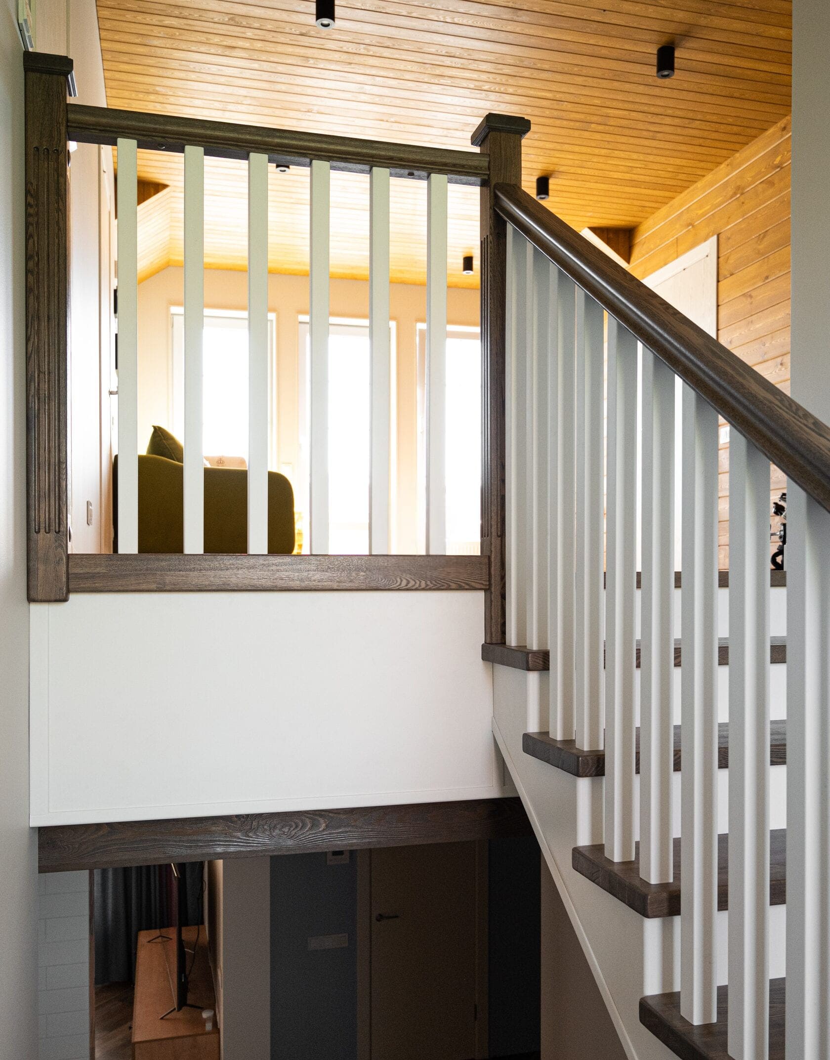 Обшивка металлического каркаса сращенным ясенем. Каркас ставили мы. Подступенки и плинтус из МДФ. Ограждение с деревянными балясинами. Под лестницей сделали кладовку. Внизу лестницы детская калитка