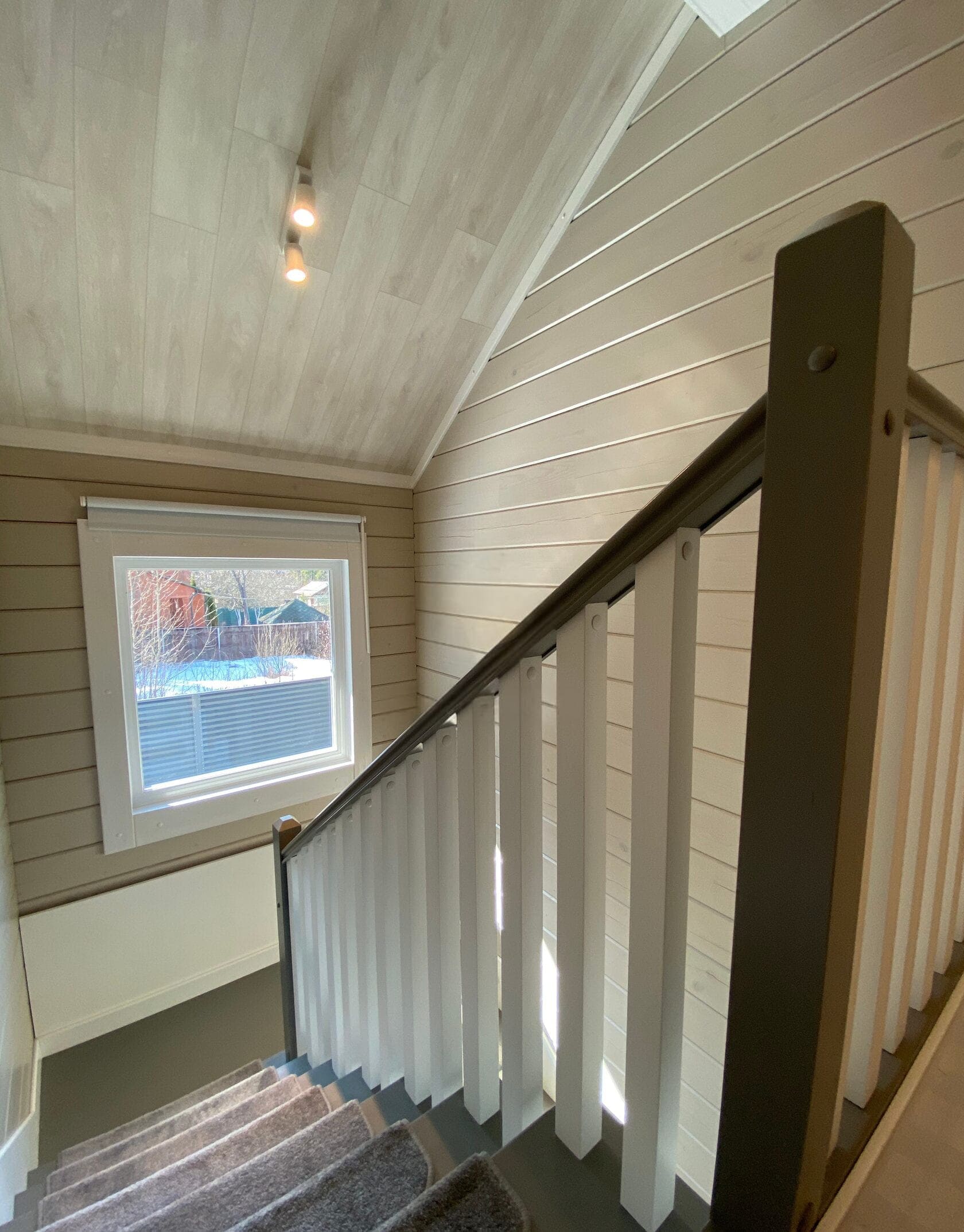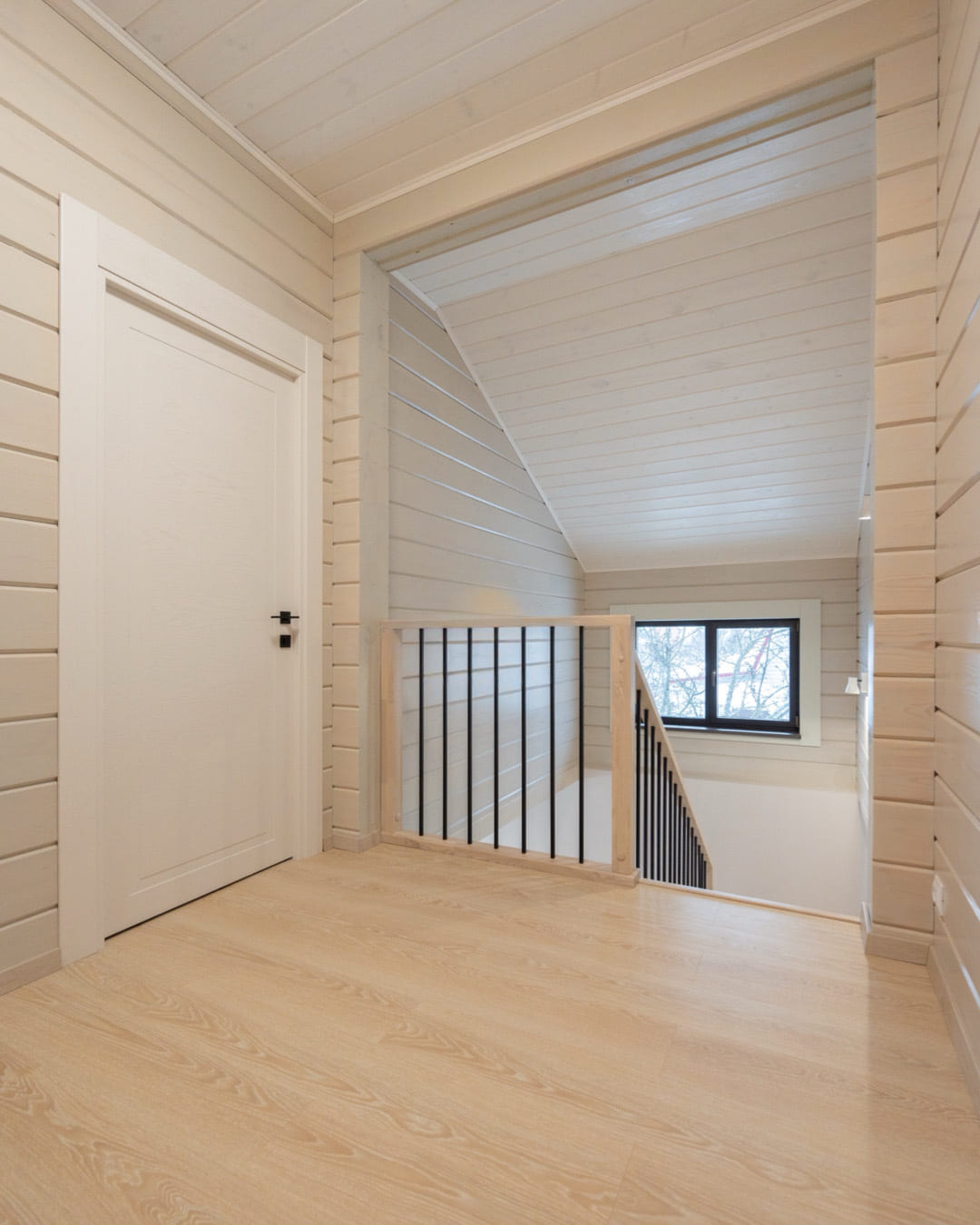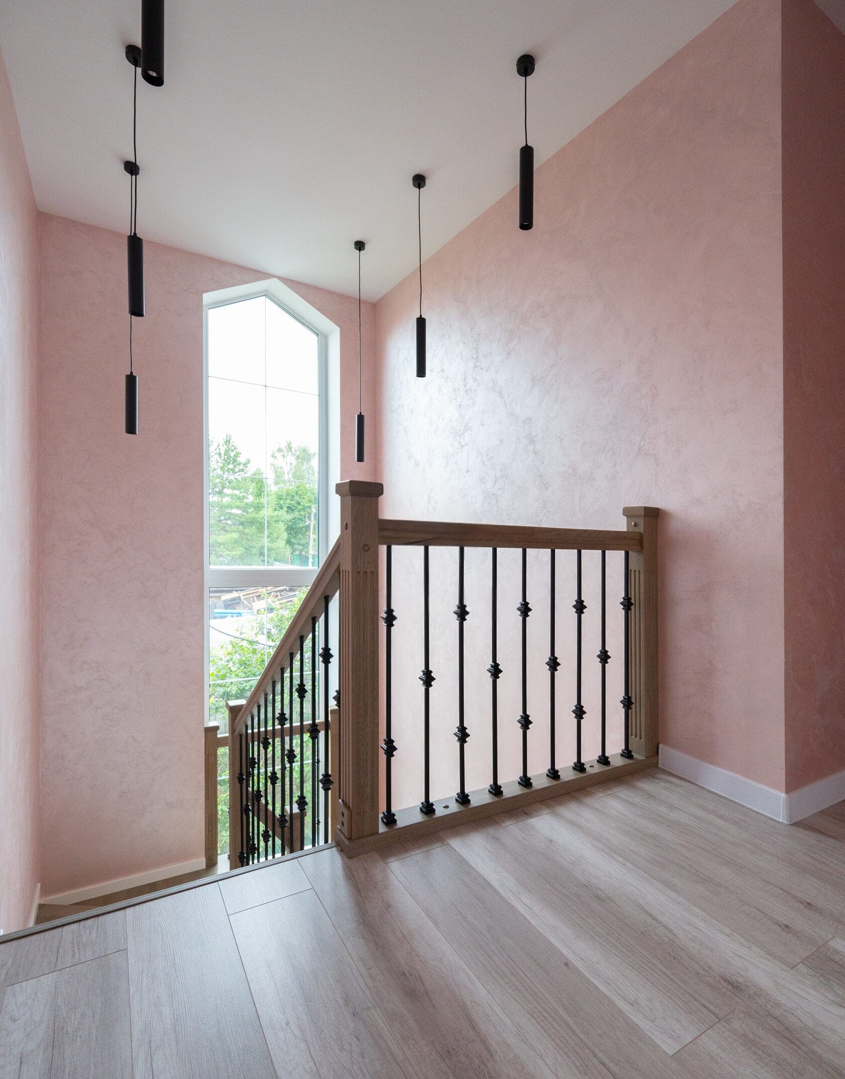 Огражедние с металлическими балясинами на лестнице, балюстраде и у окна.