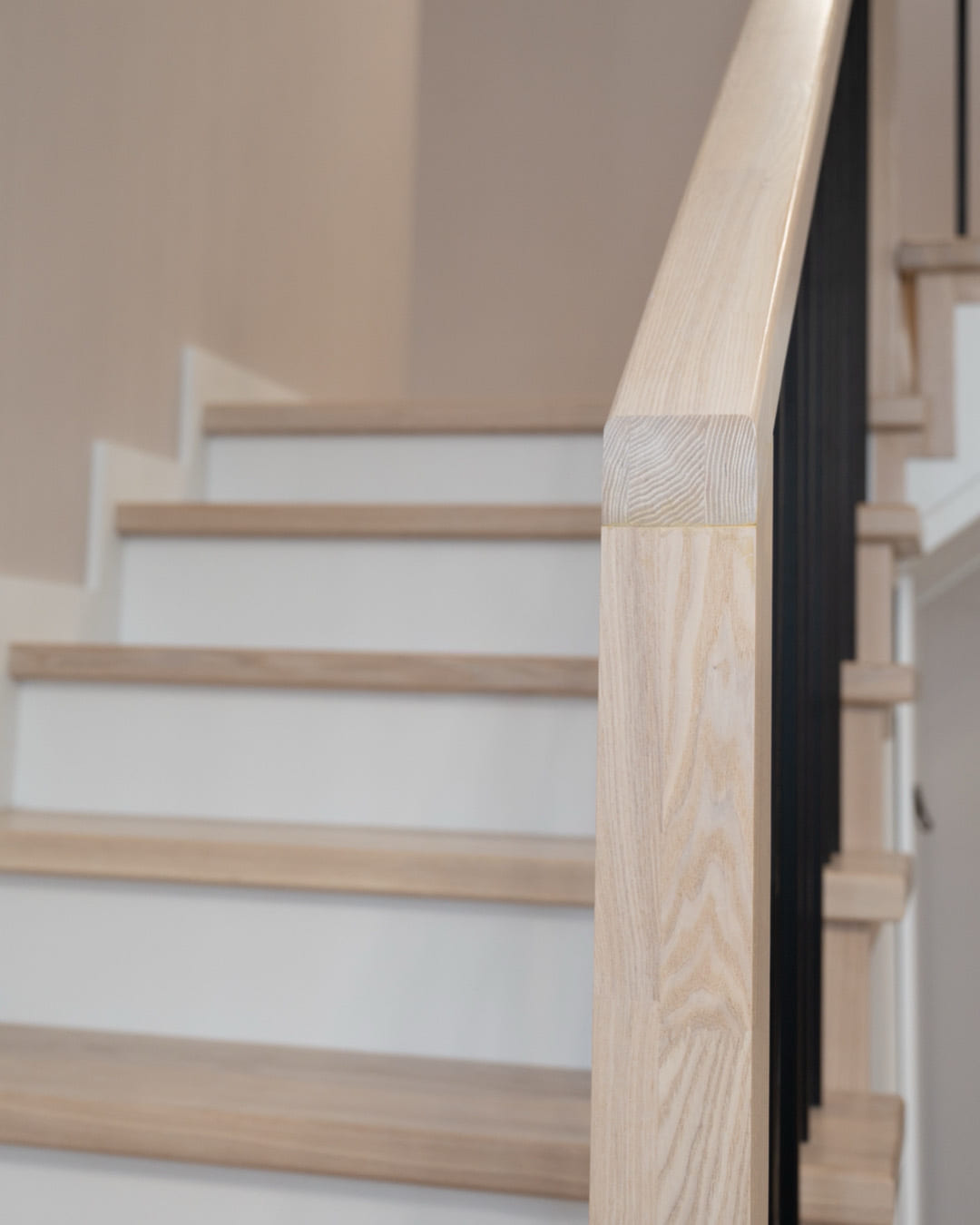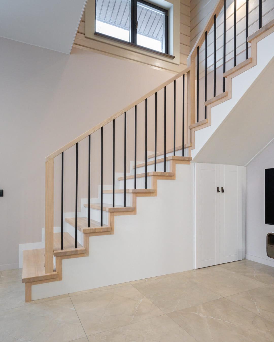 Лестница на деревянном каркасе со ступенями из сращенного дуба в сером цвете.
