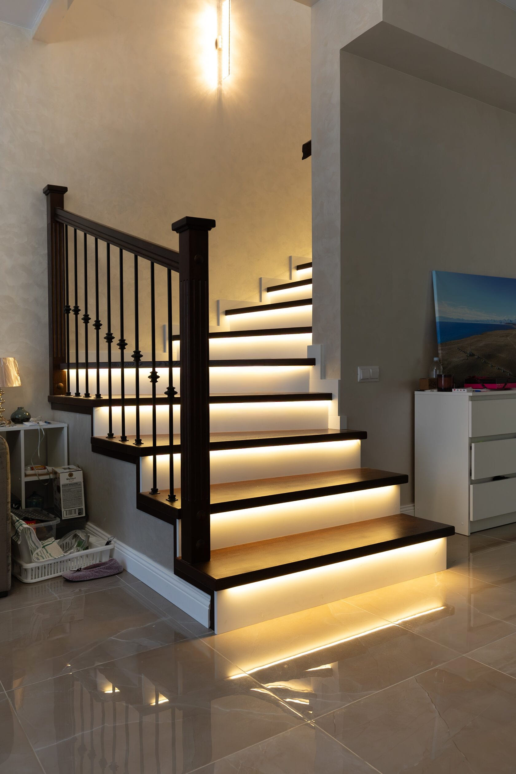 Лестница на металлическом каркасе с первого на второй и небольшая в цокольный этаж.